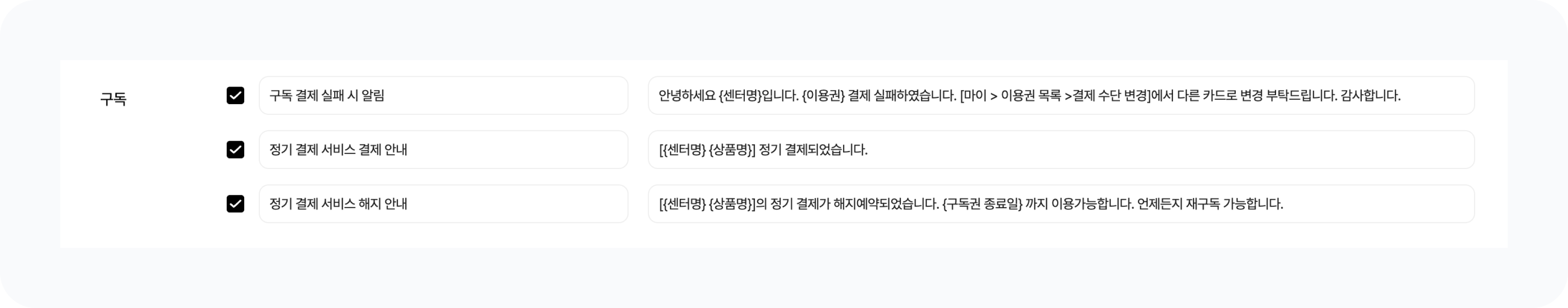 구독 : 구독권 결제, 결제 실패, 해지 안내 메시지가 전송됩니다.