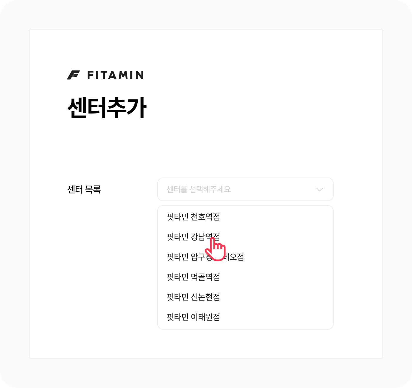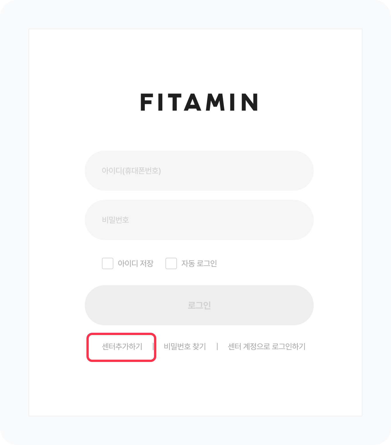 우선 핏타민 CRM(http://crm.fitamin.io) 에 접속 > 메인에서 센터 추가하기 버튼을 클릭해주세요.