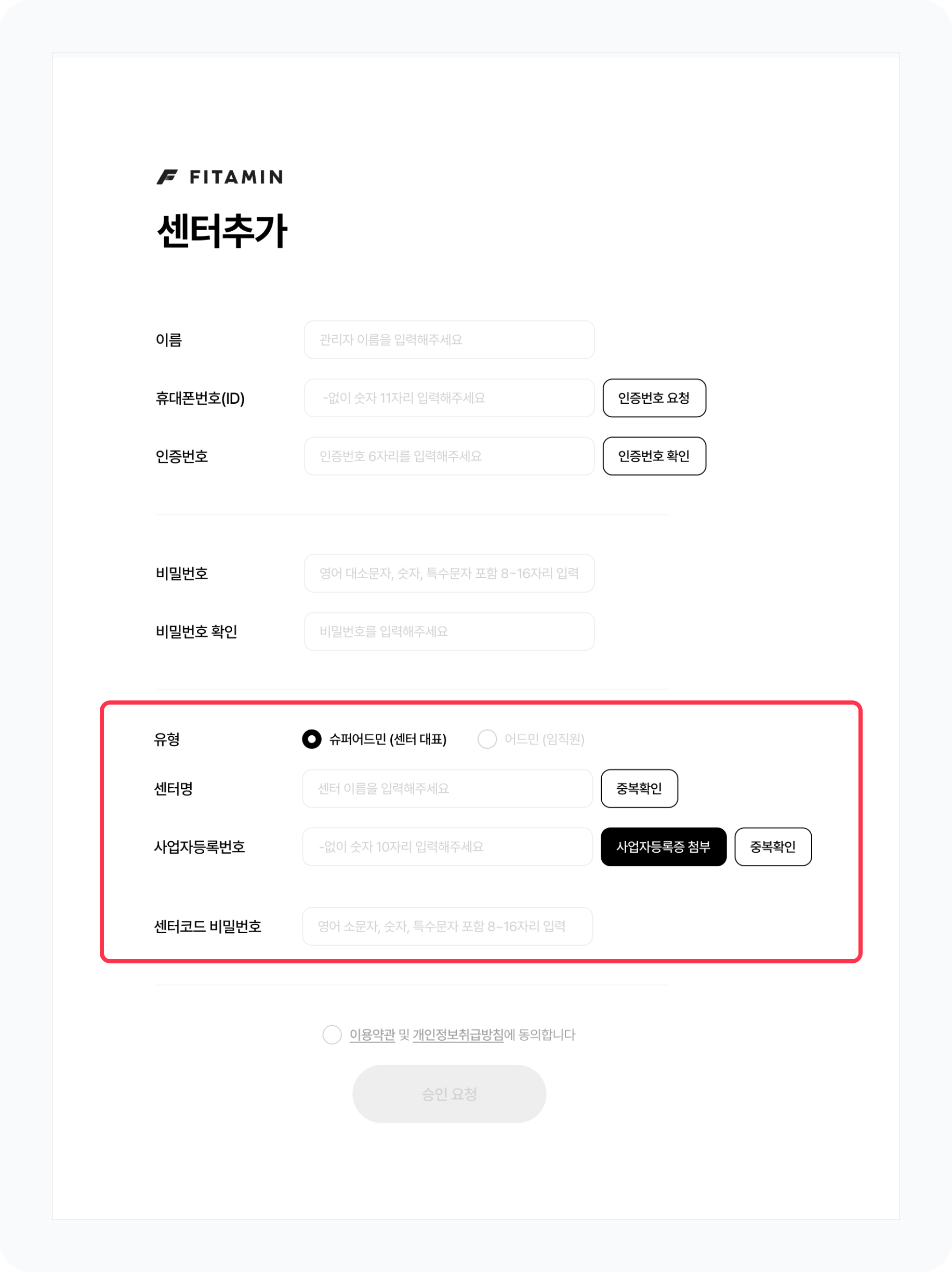 [센터추가하기 > 슈퍼어드민(센터 대표)]을 선택한 후 센터명과 사업자등록번호를 입력하고 센터를 추가해주세요.
