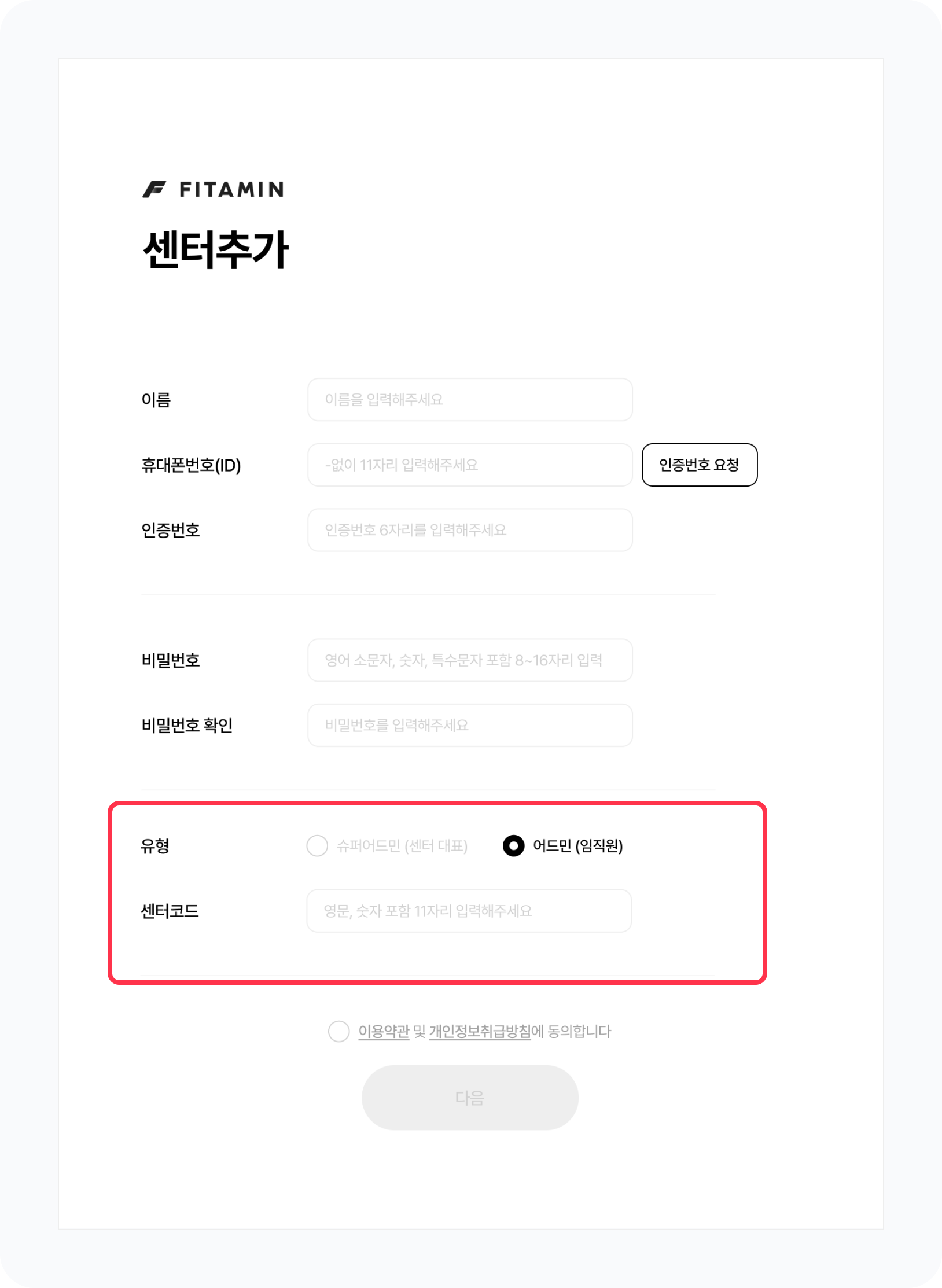 어드민(임직원)을 선택해주세요. (새로운 센터를 추가하는 경우슈퍼어드민(센터 대표)를 선택하고 가입을 진행하세요)센터코드 : 가입할 센터의 센터코드를 입력해주세요.