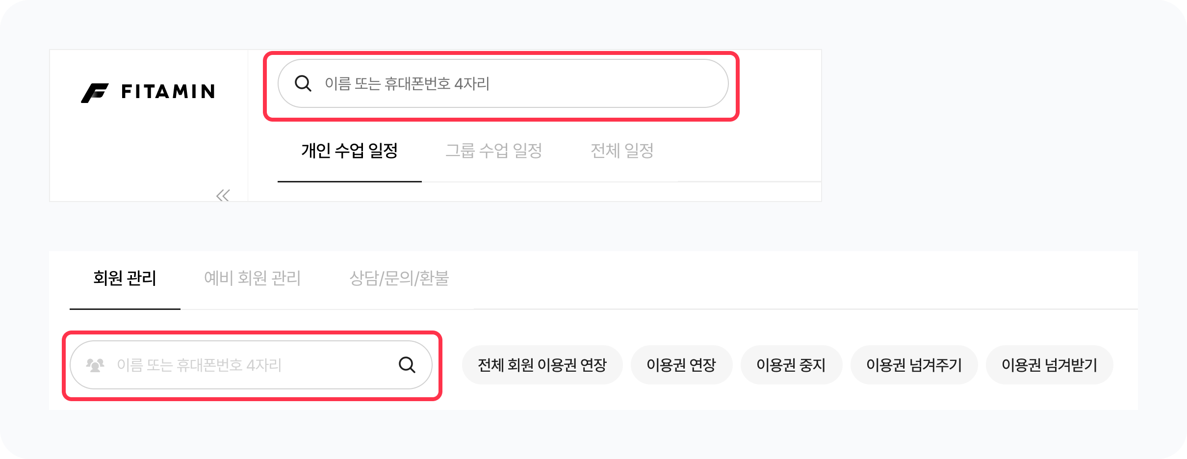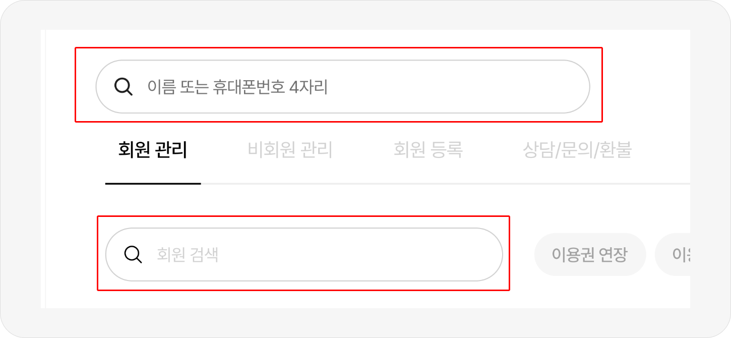 회원 이름 또는 휴대폰 번호 4자리를 입력하여 회원을 검색할 수 있어요.