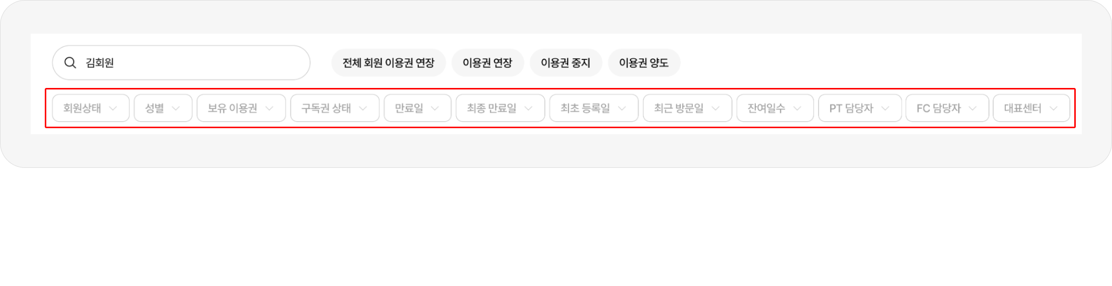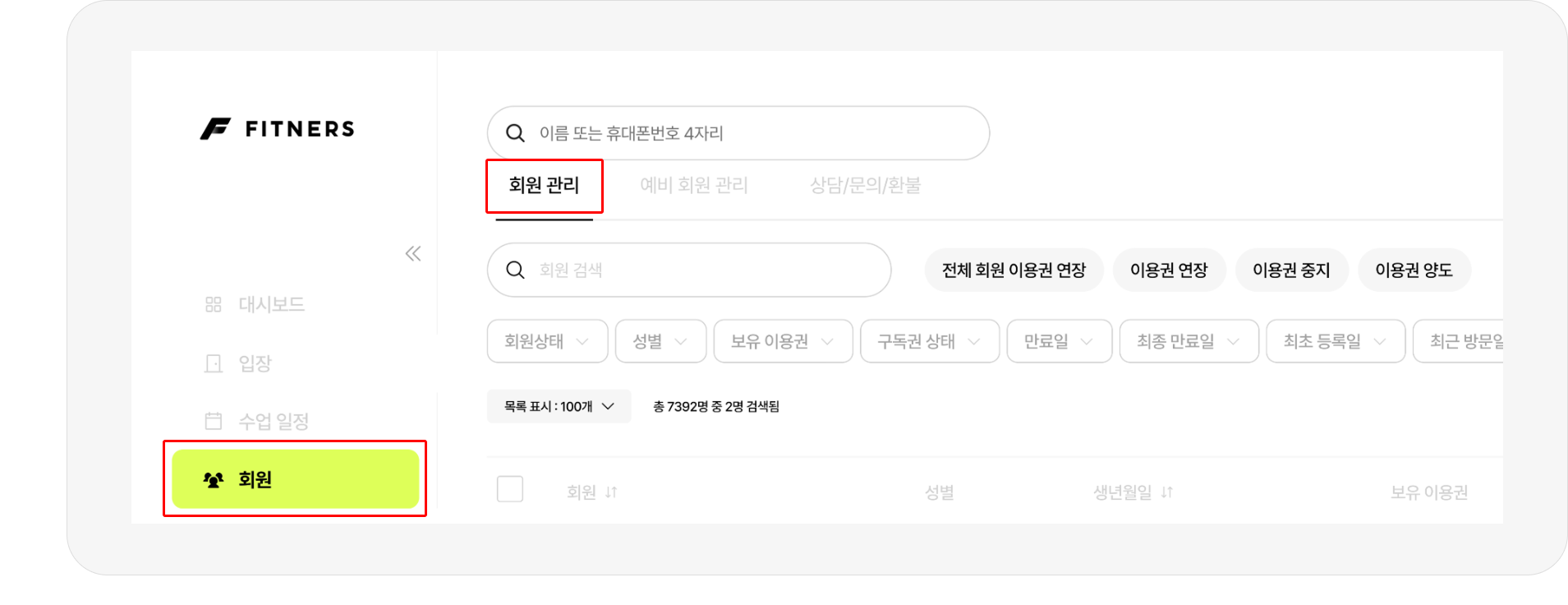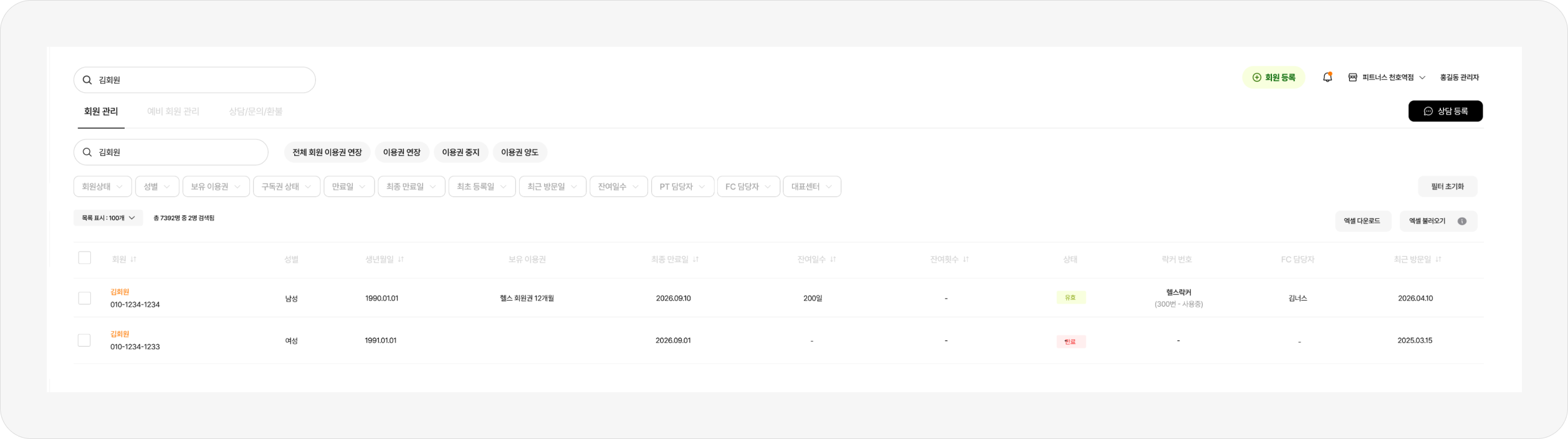 [상태] : 회원 상태는 대여 이용권을 제외한 이용권 (일반이용권, PT이용권, 구독권)을 기준으로 표시됩니다.