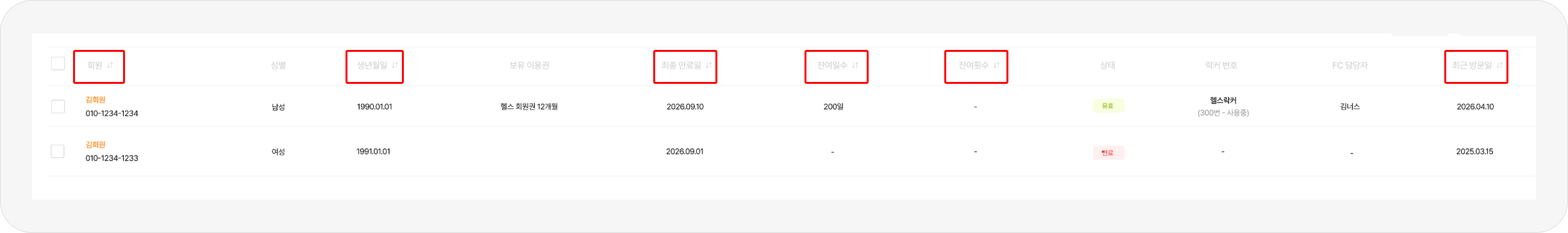 목록에서 회원, 생년월일, 최종 만료일, 잔여일수, 잔여횟수, 최근 방문일을 누르면 목록을 오름차순 - 내림차순으로 정렬할 수 있어요.