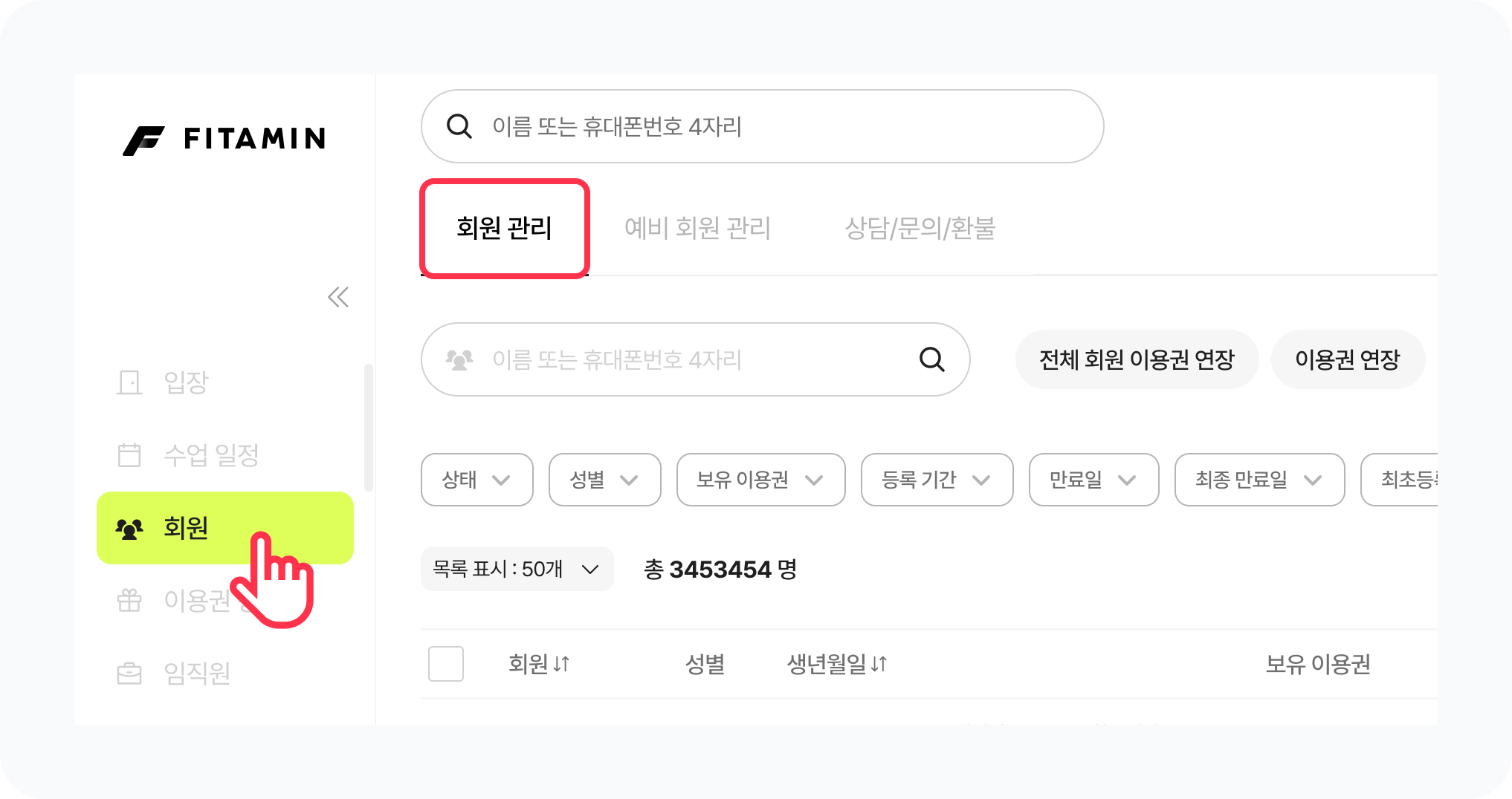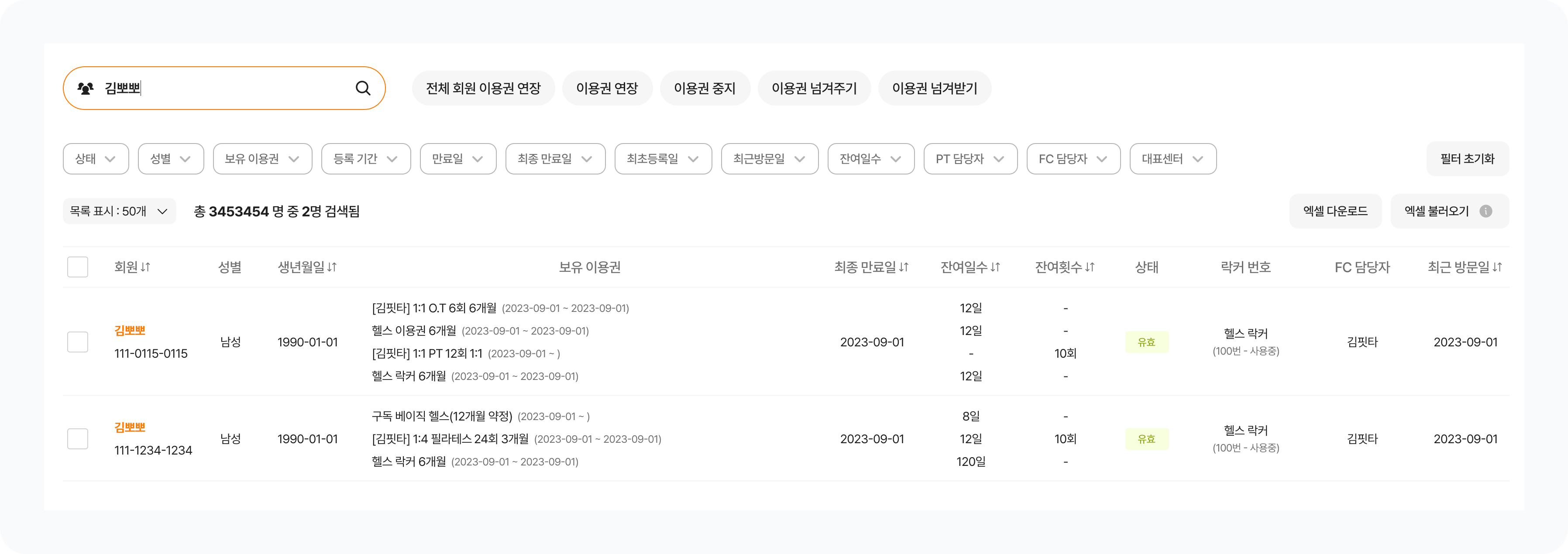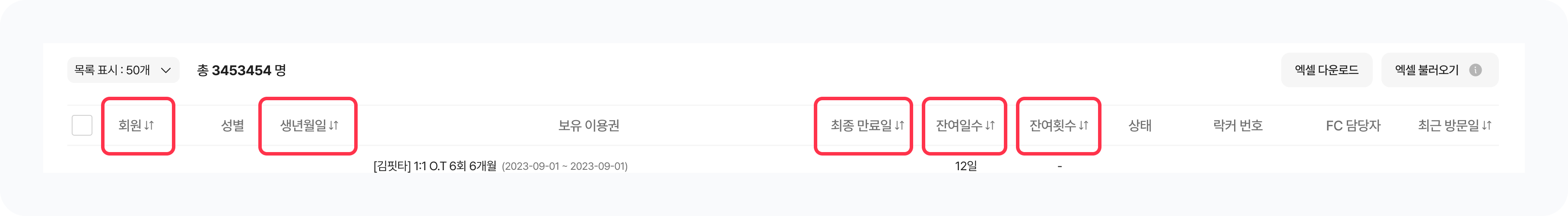 목록에서 회원, 생년월일, 최종 만료일, 잔여일수, 잔여횟수를 누르면 목록을 오름차순 - 내림차순으로 정렬할 수 있어요.