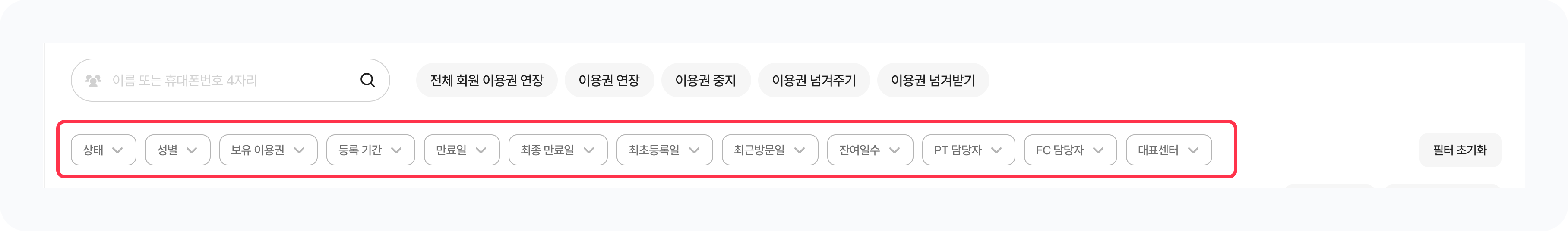 회원 목록 상단의 필터를 적용하여 관리가 필요한 회원만 모아서 조회할 수 있어요.