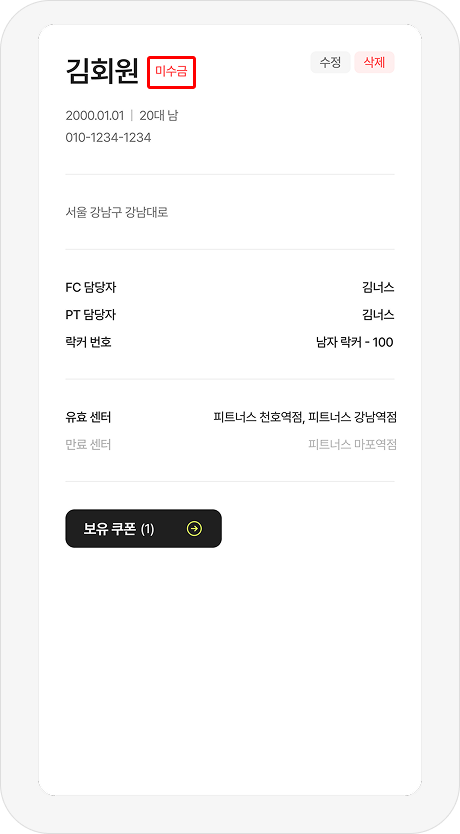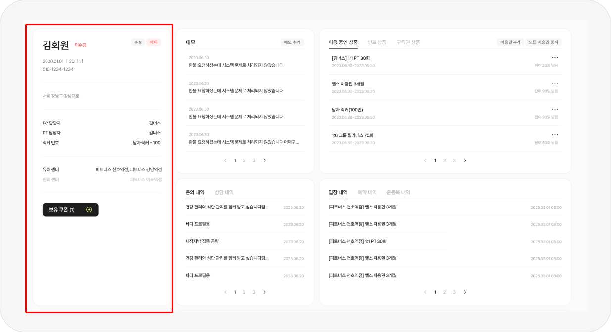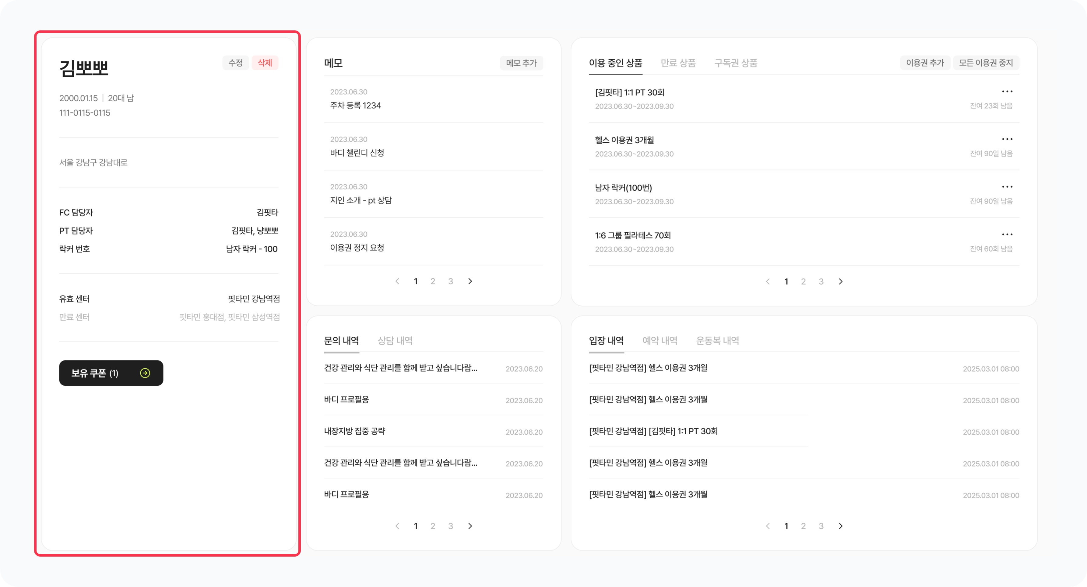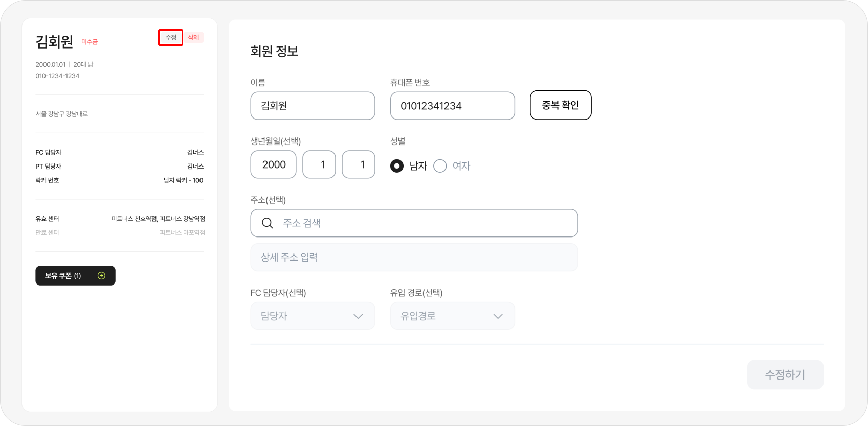 좌측 상단의 회원 정보 카드에서 회원의 기본정보를 확인하고 수정할 수 있어요.