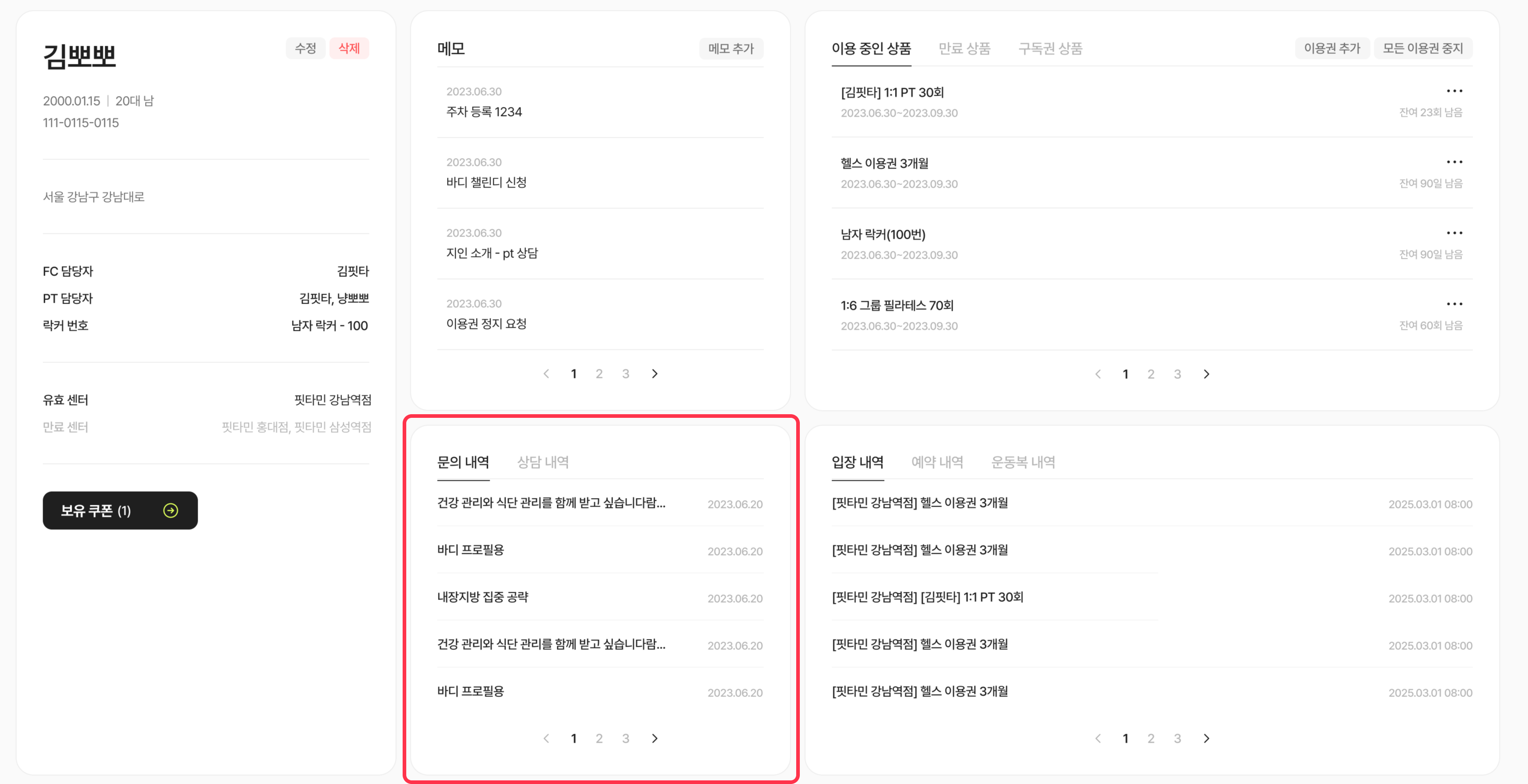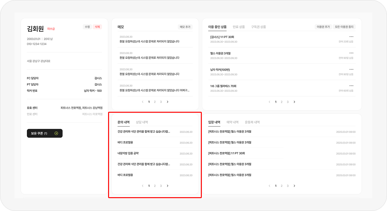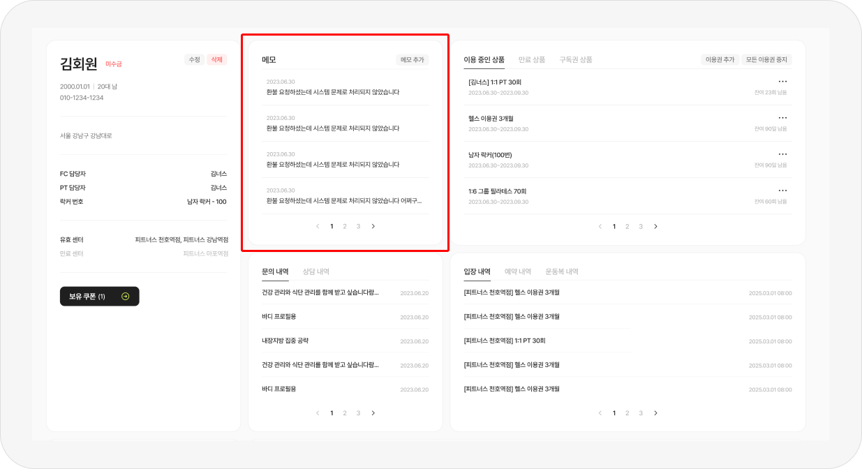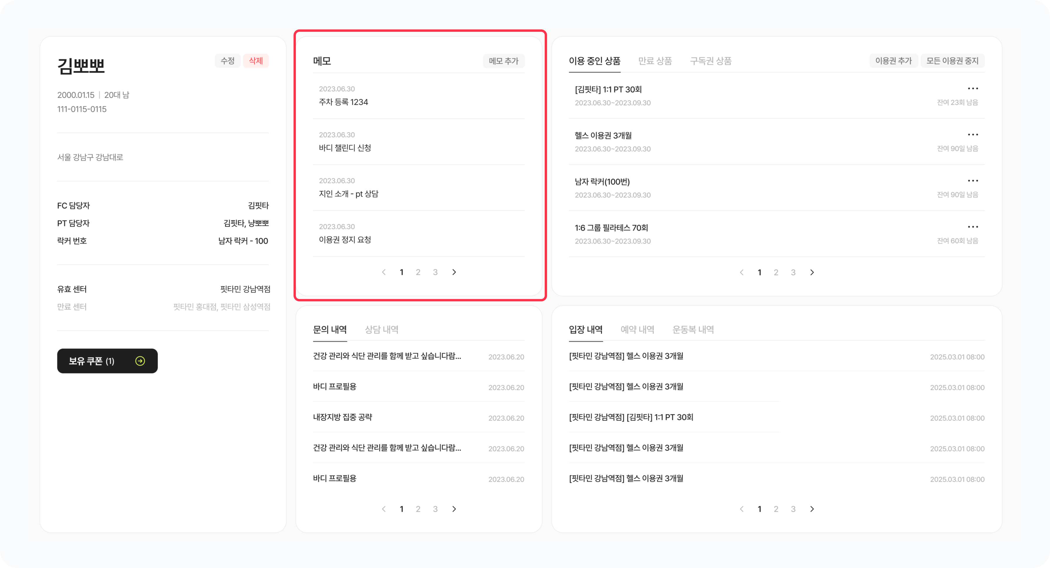 좌측 상단의 회원 정보 카드에서 회원의 기본정보를 확인하고 수정할 수 있어요.