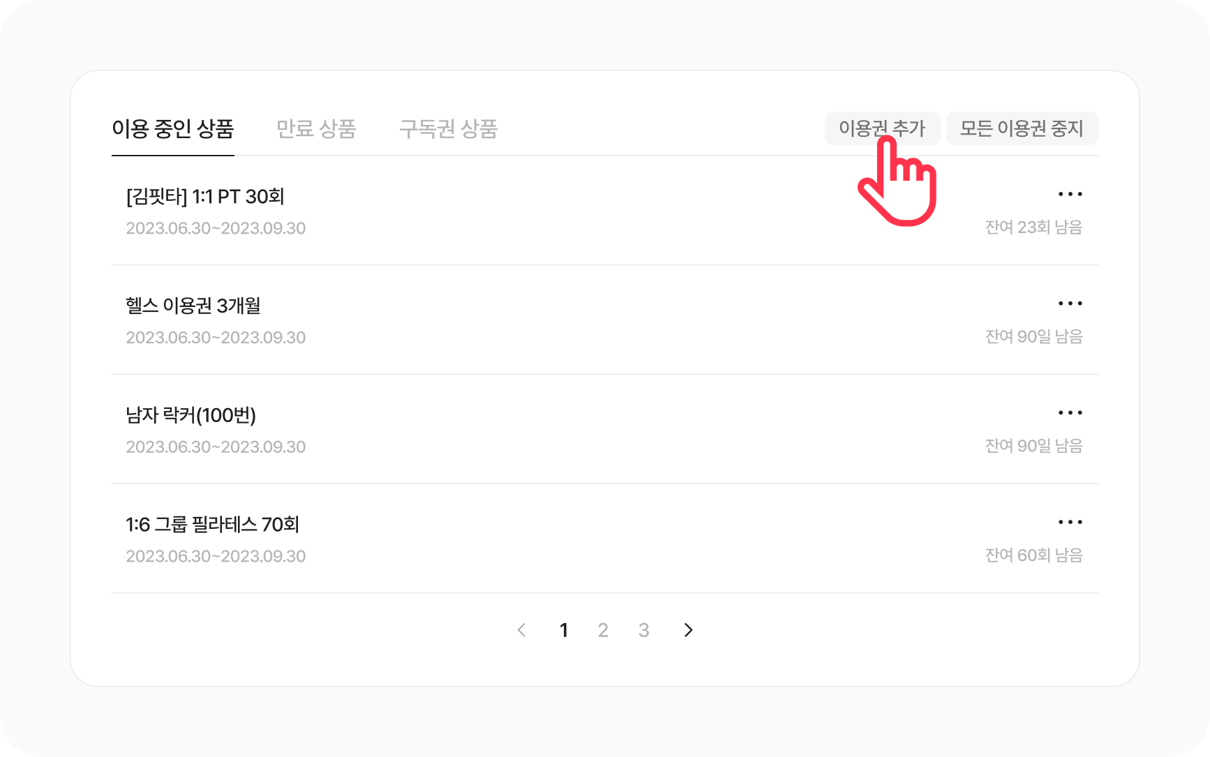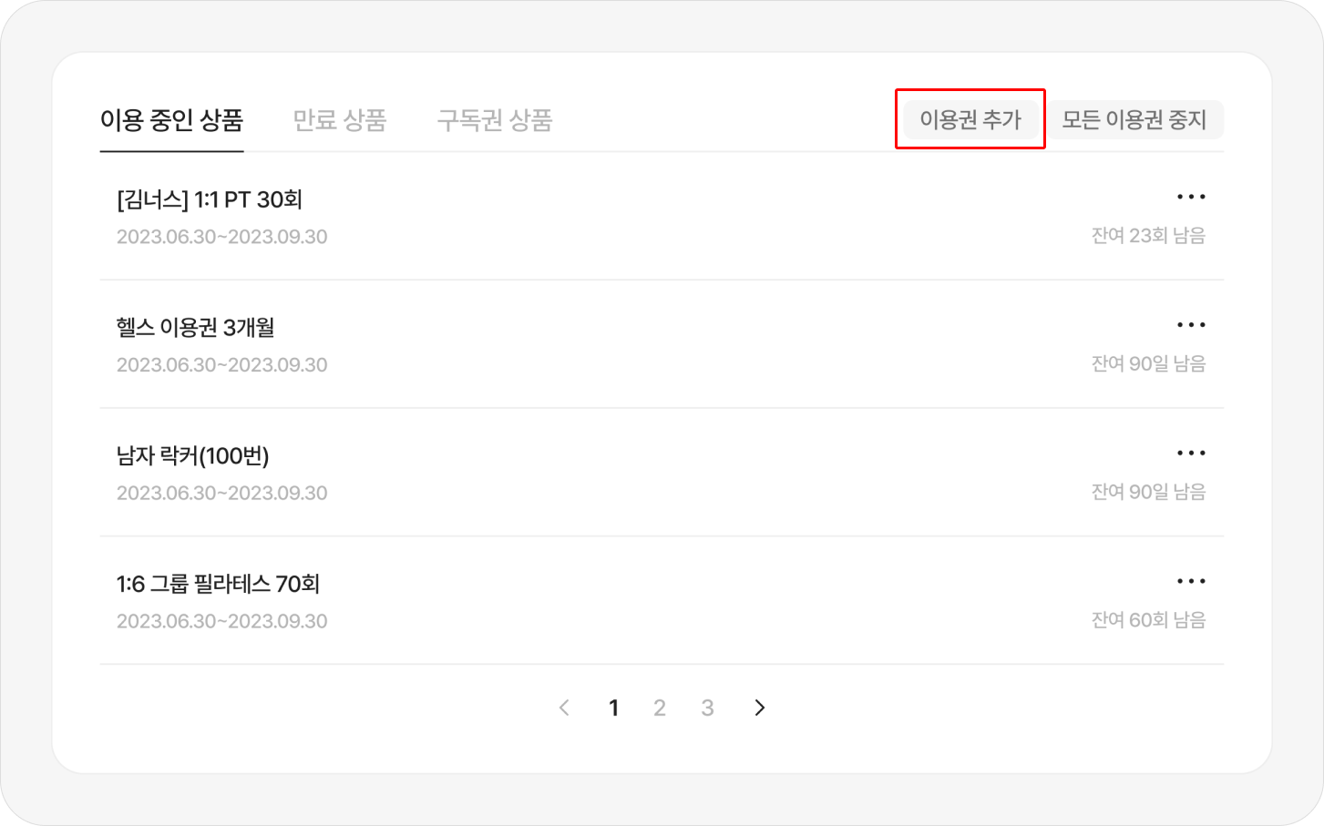 오른쪽 상단의 이용권 추가 버튼을 눌러 새로운 이용권을 추가할 수 있어요.