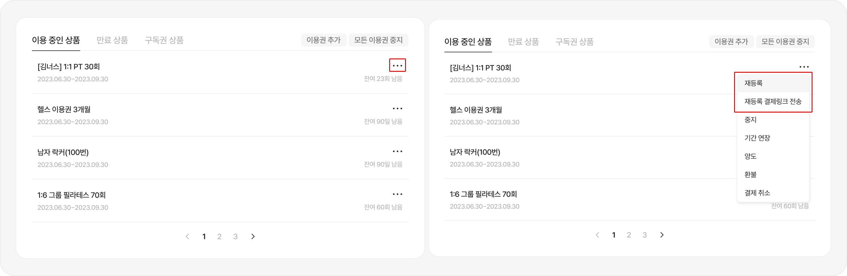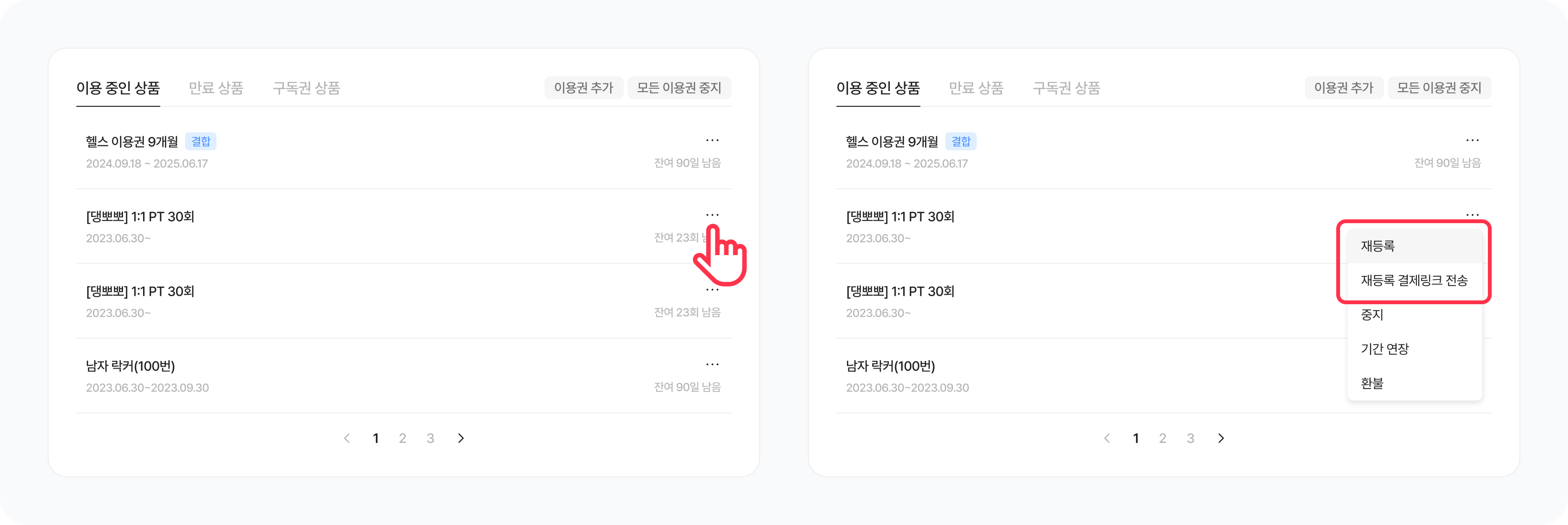 재등록 또는 재등록 결제링크 전송 을 선택해 이용권을 편리하게 재등록할 수 있어요.