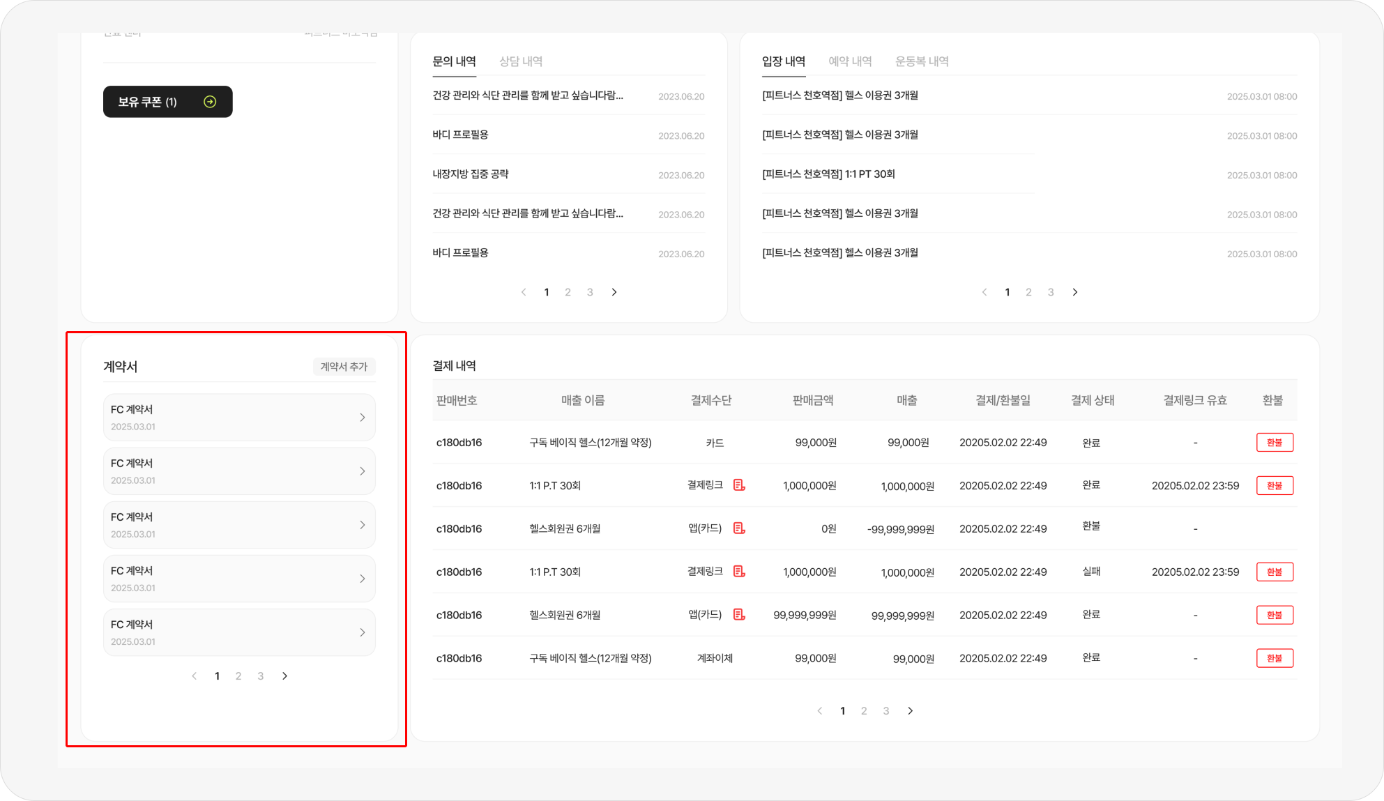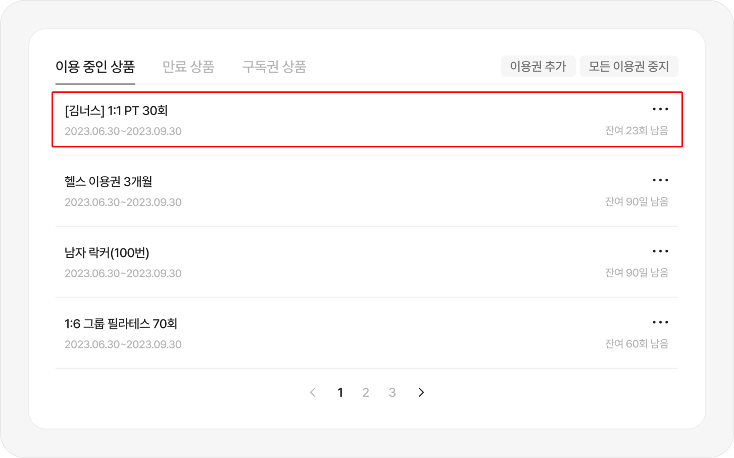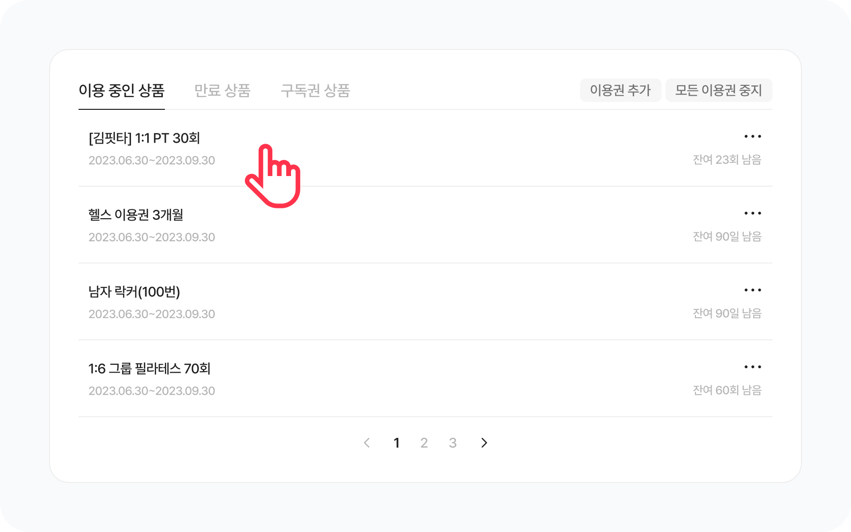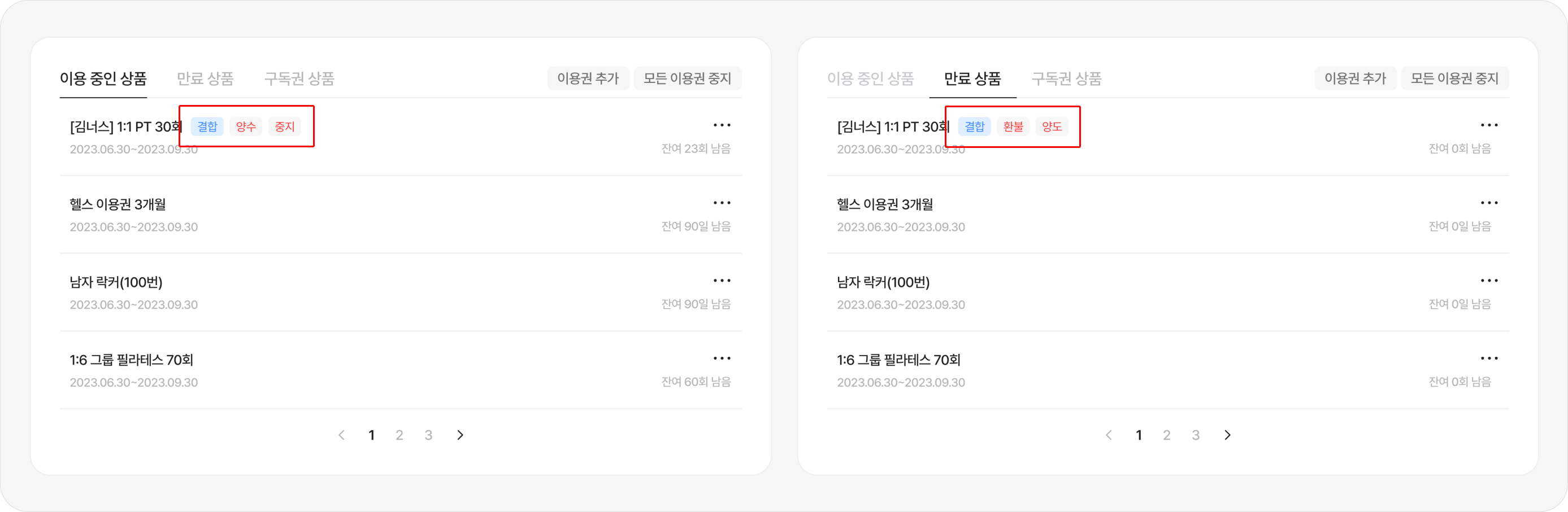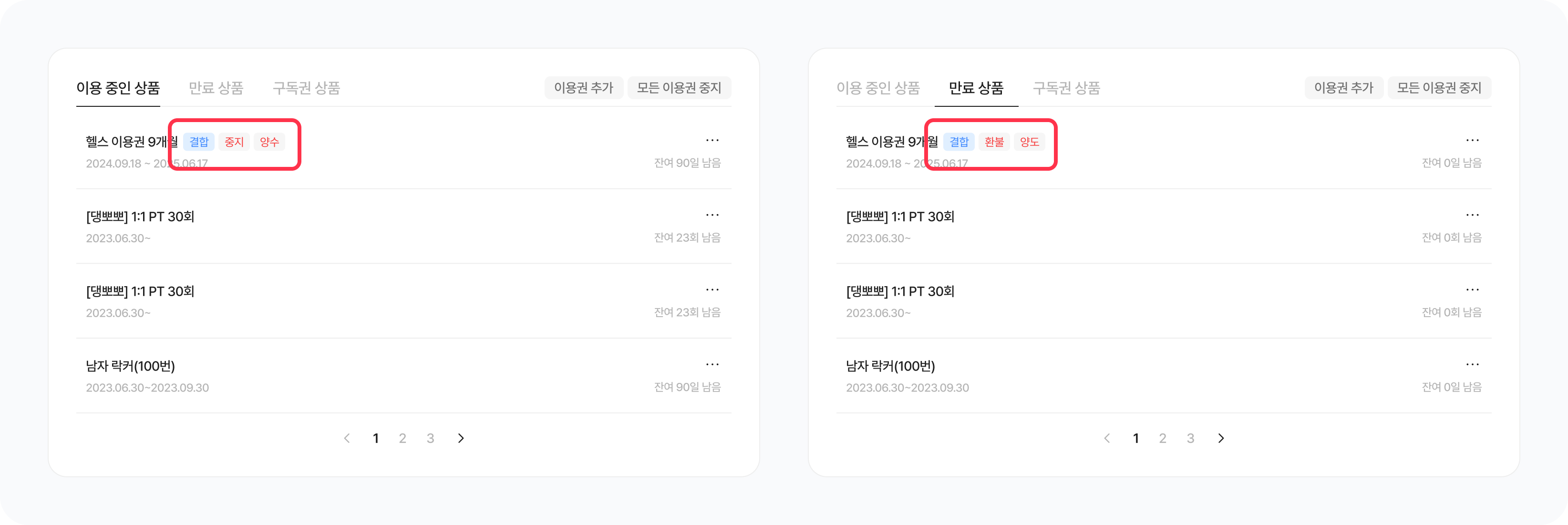 회원이 보유한 이용권(유효 이용권, 만료 이용권)을 한 눈에 확인하고 편리하게 관리할 수 있어요.