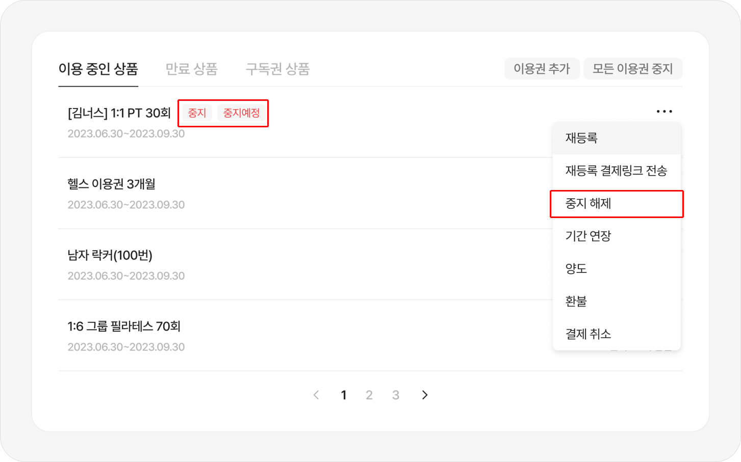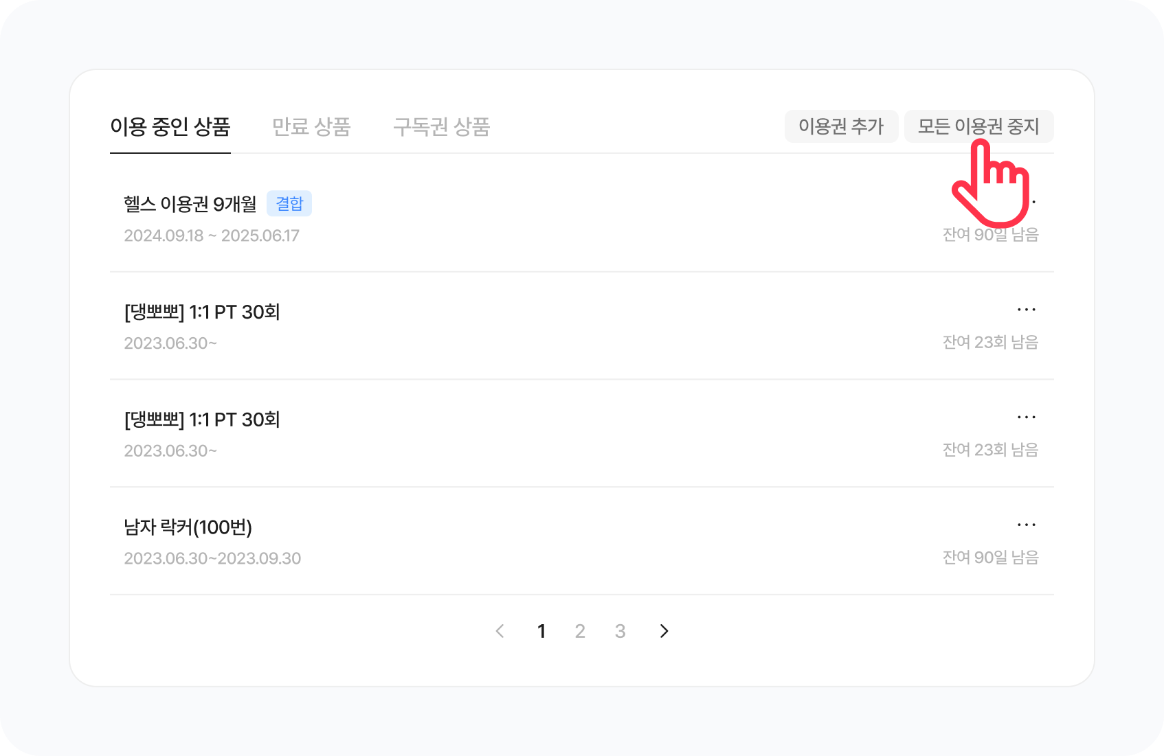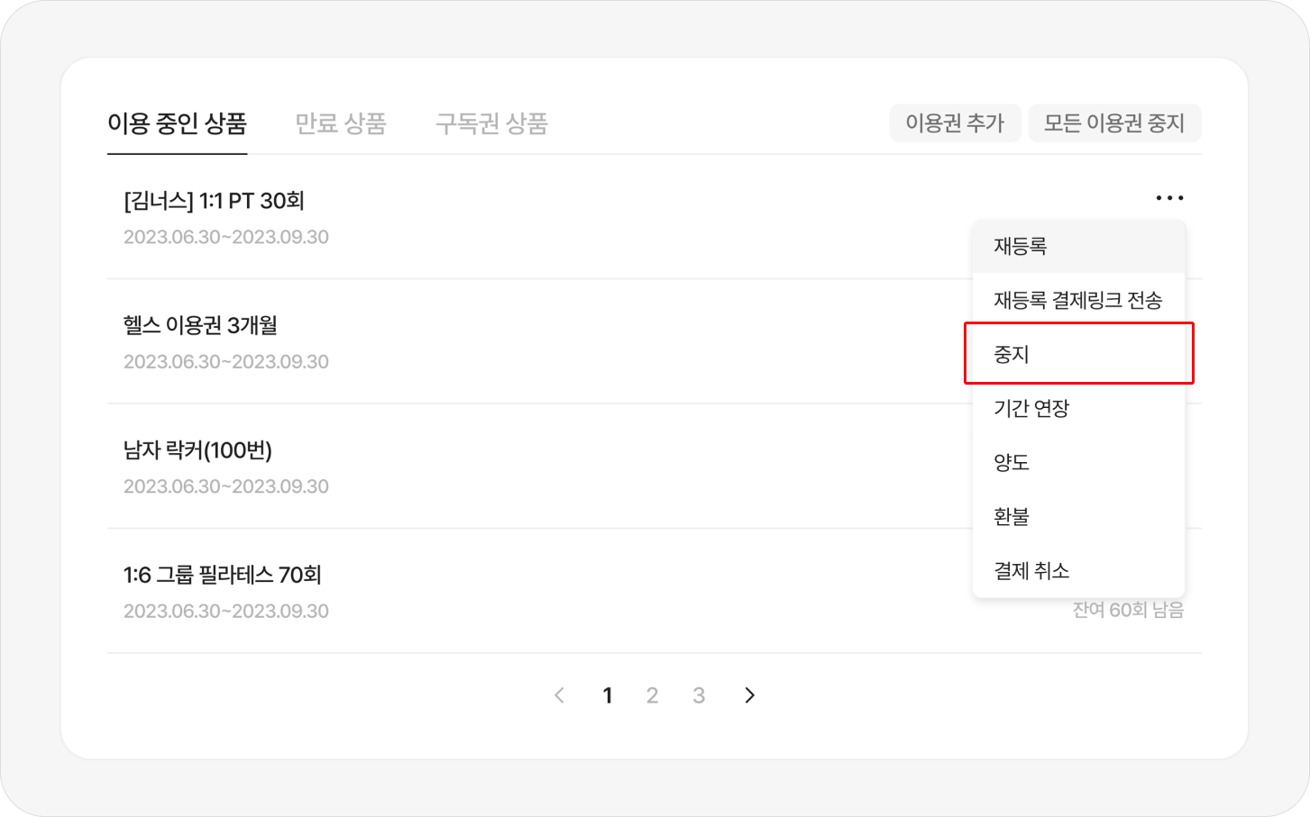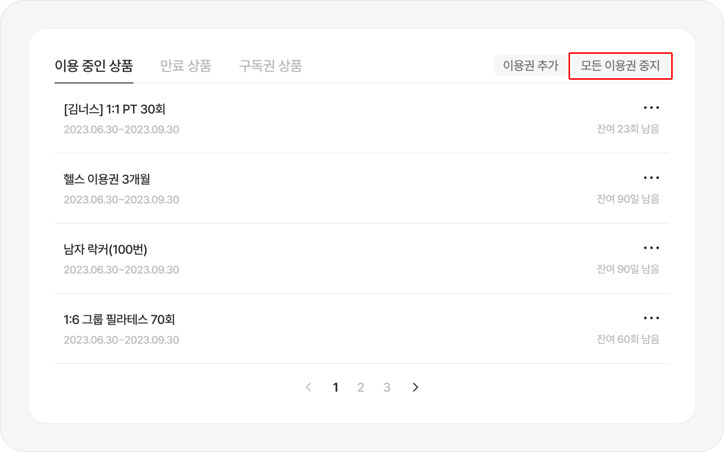 모든 이용권 중지 버튼을 눌러 회원이 보유한 전체 이용권을 한 번에 중지 설정할 수 있어요.
