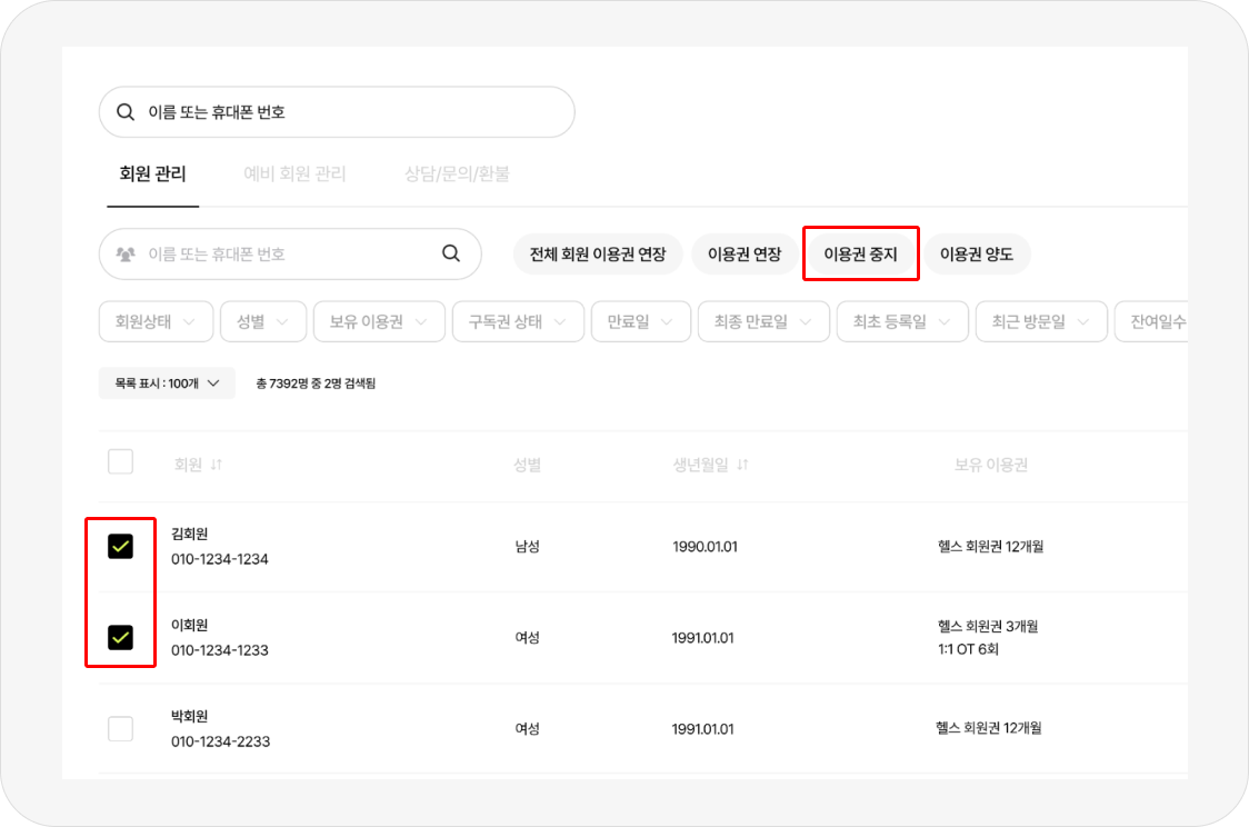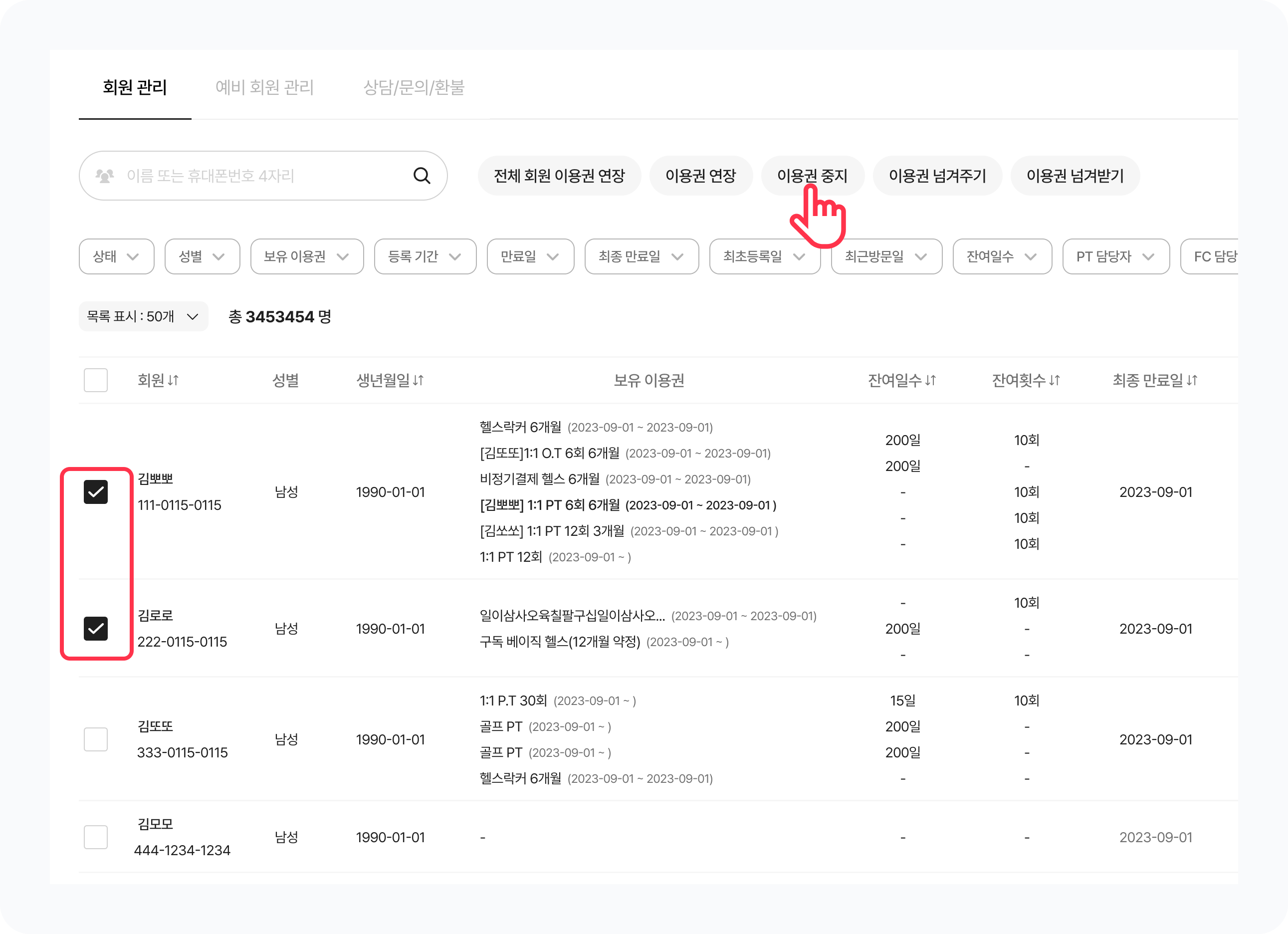 💡 [회원 관리 목록]에서 여러 회원을 선택한 후 이용권 중지 버튼을 클릭하면 선택한 회원의 모든 이용권을 일괄적으로 중지할 수 있어요.