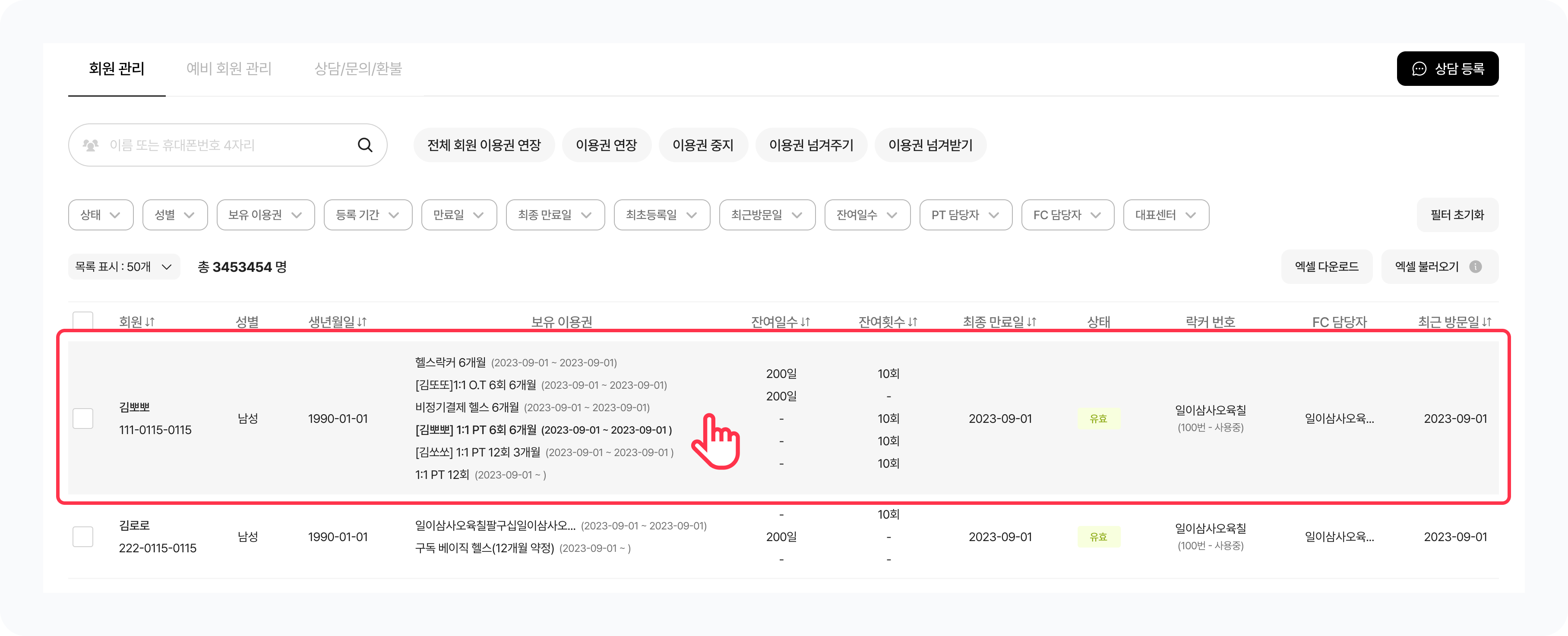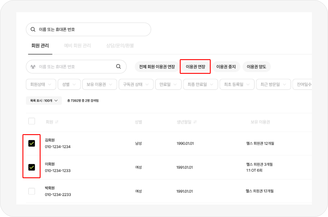 [회원 관리 목록]에서 회원을 선택한 후 이용권 연장 버튼을 클릭하면 선택한 회원의 모든 이용권의 기간을 일괄적으로 연장할 수 있어요.
