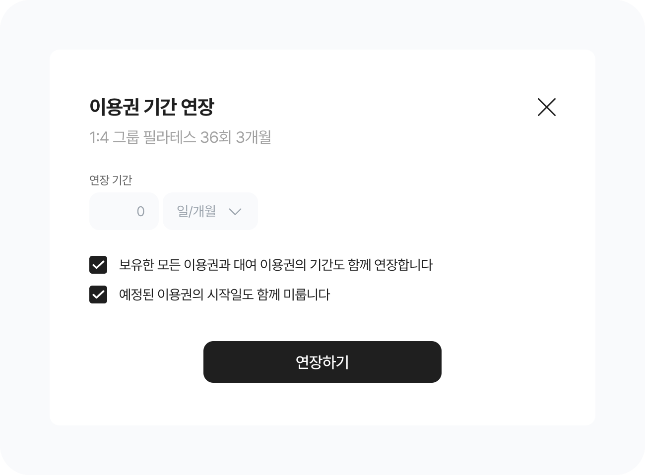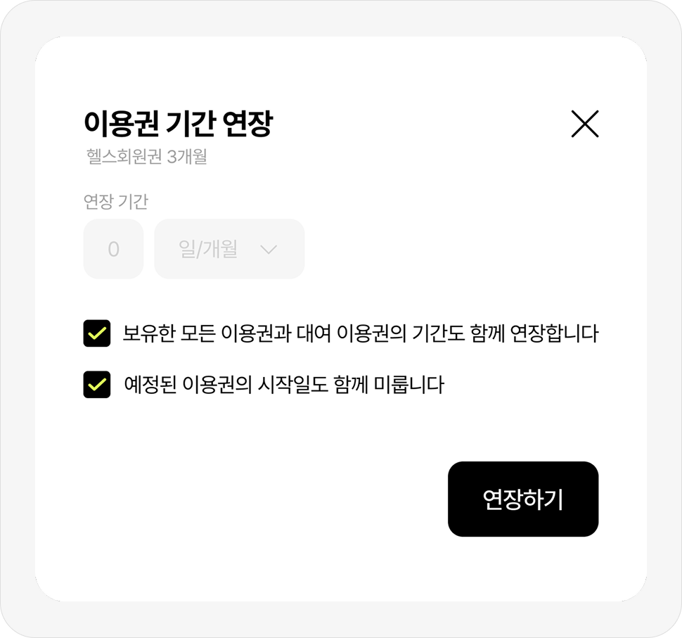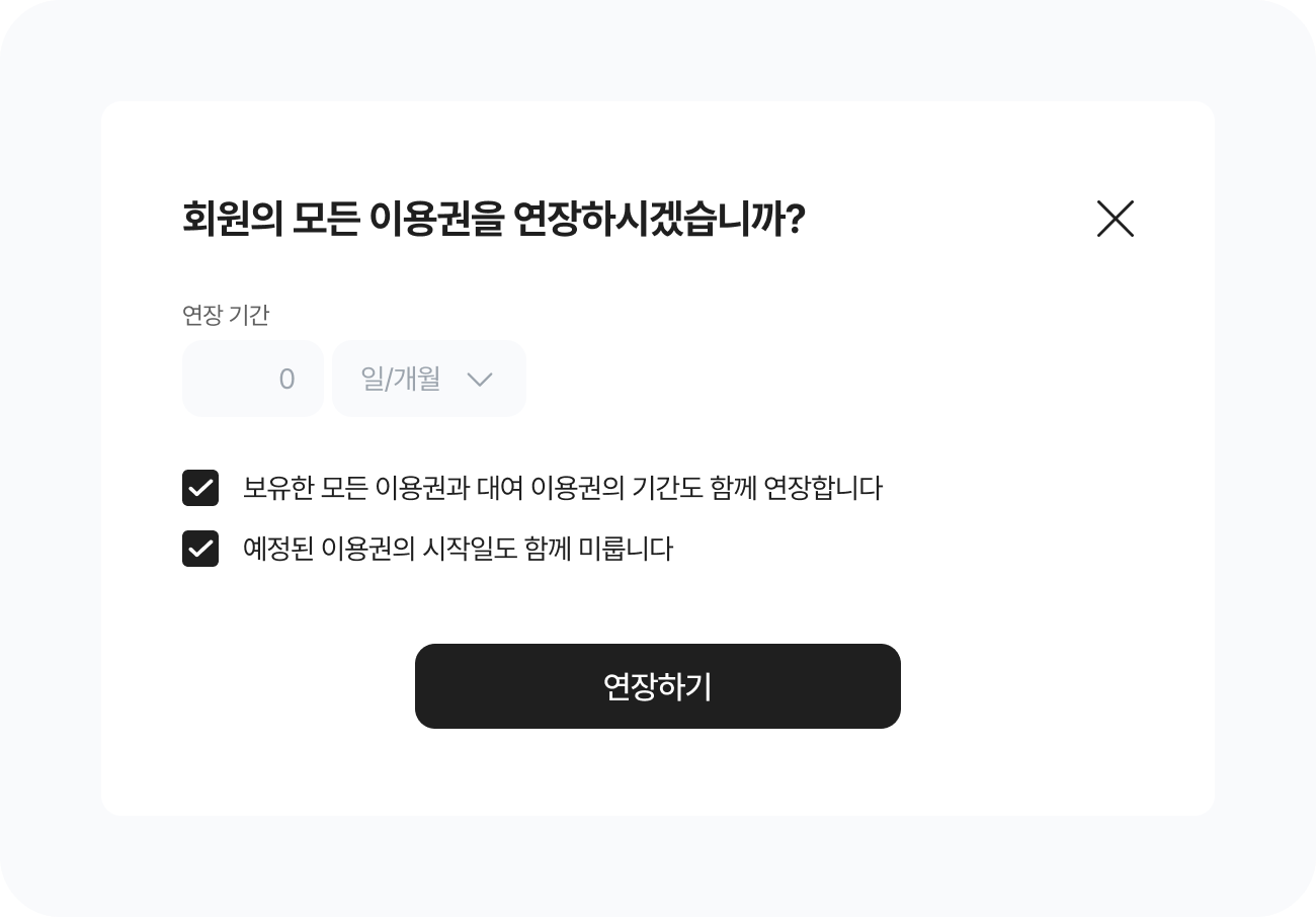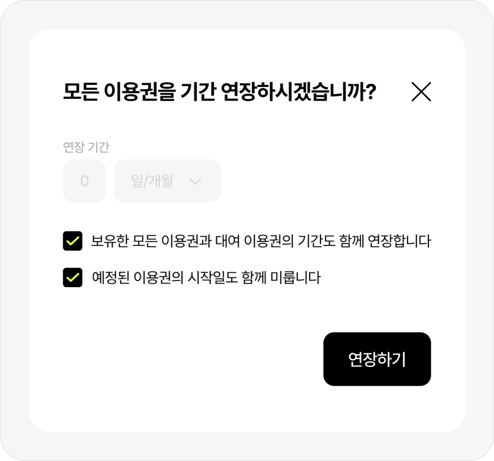 보유한 모든 이용권과 대여 이용권의 기간도 함께 연장합니다 : 현재 이용중인 모든 이용권의 사용기간이 연장돼요. (이용이 예정된 이용권의 기간은 연장되지 않습니다.)