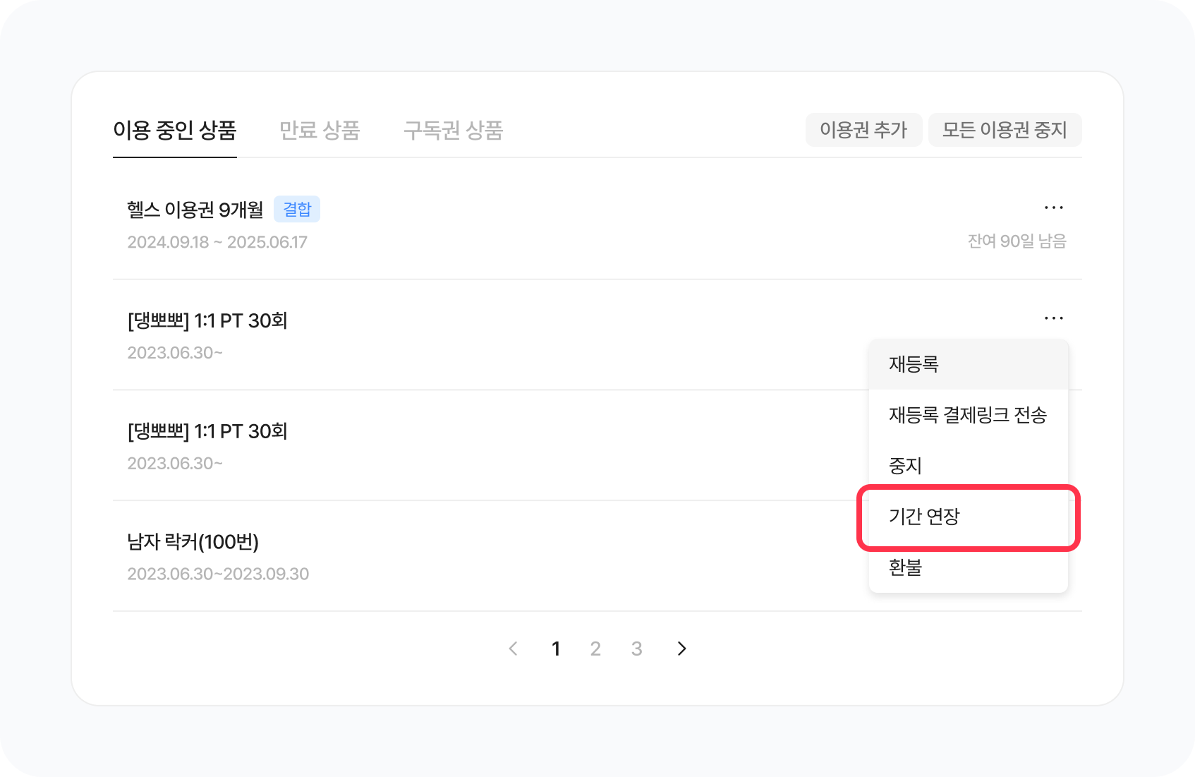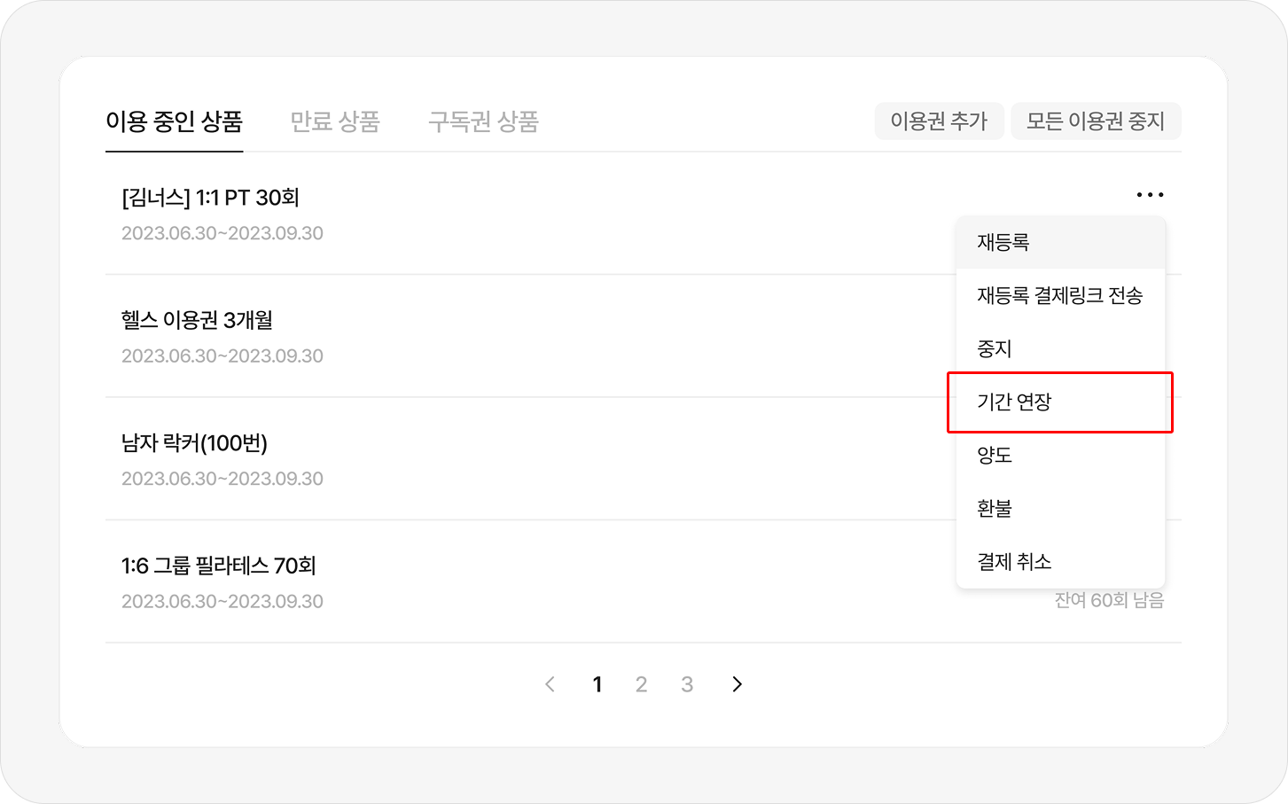 개별 상품의 [상품 옵션 > 기간 연장] 버튼을 눌러 이용권의 사용 기간을 연장할 수 있어요.