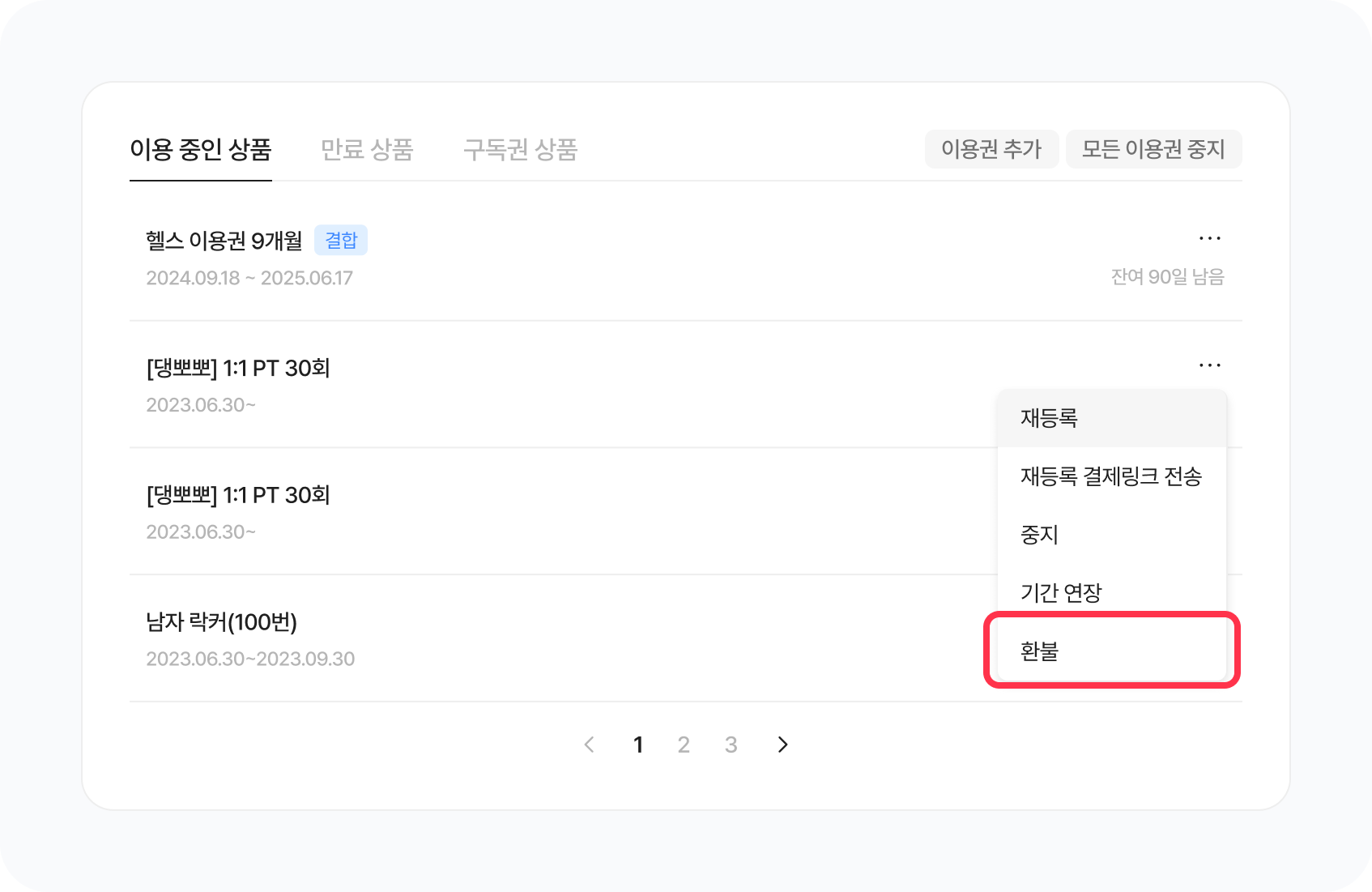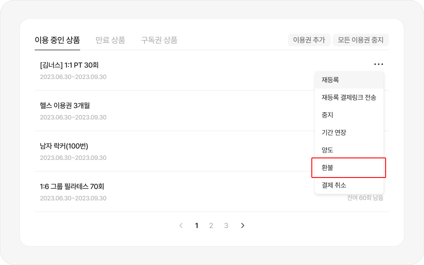 개별 상품의 [상품 옵션 > 환불] 버튼을 눌러 이용권을 환불 처리 할 수 있어요.