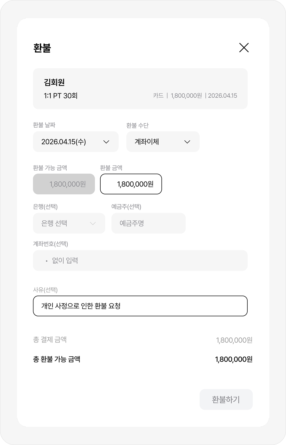 회원 이름과 환불할 이용권 정보, 결제 내역을 확인해주세요.