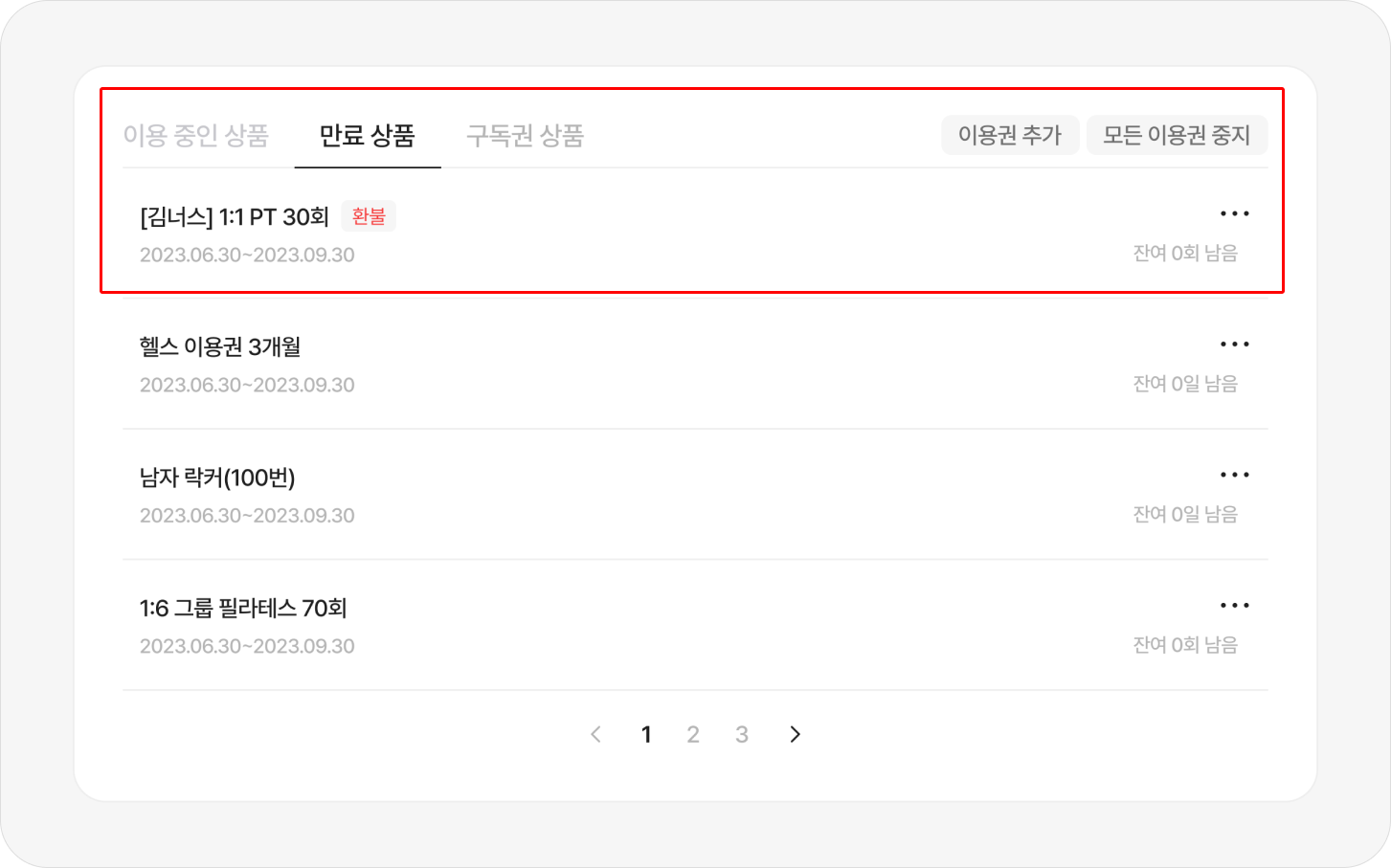 환불 완료된 이용권은 [만료 상품] 목록에서 확인 가능해요.