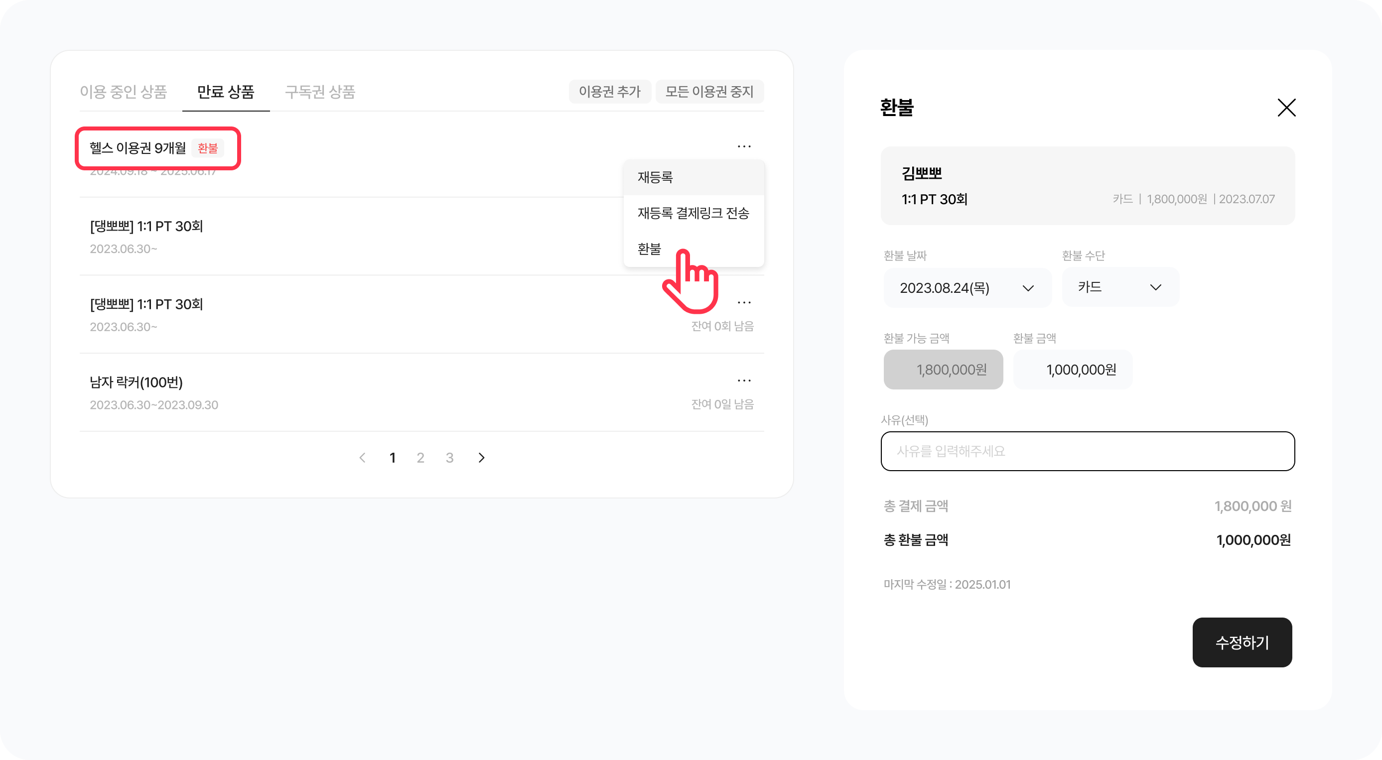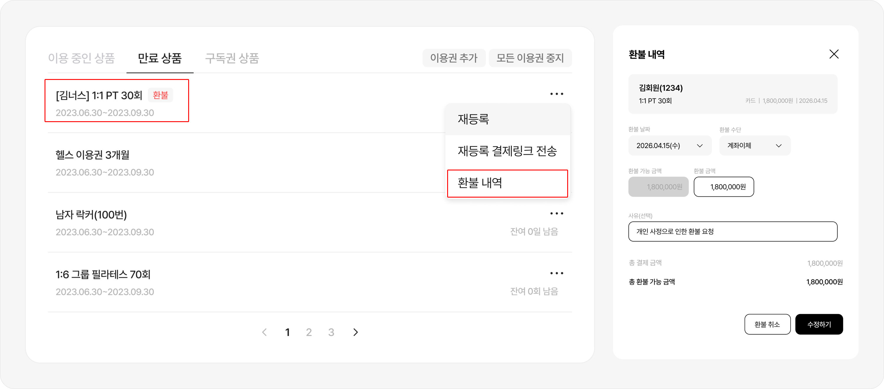 [만료 상품] 목록에서 환불한 상품을 선택해 환불 내역을 수정할 수 있어요.
