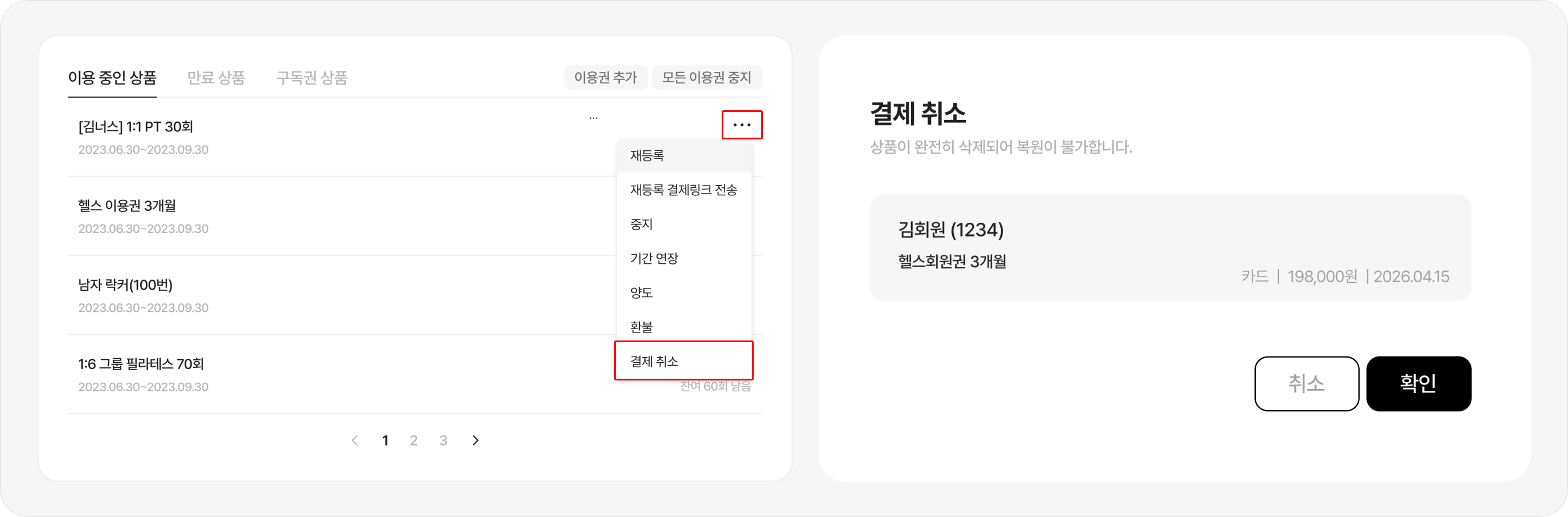 회원 상세에서 구독권 상품 클릭시 구독권 상태(해지 예약, 구독 종료) 변경이 가능합니다.
