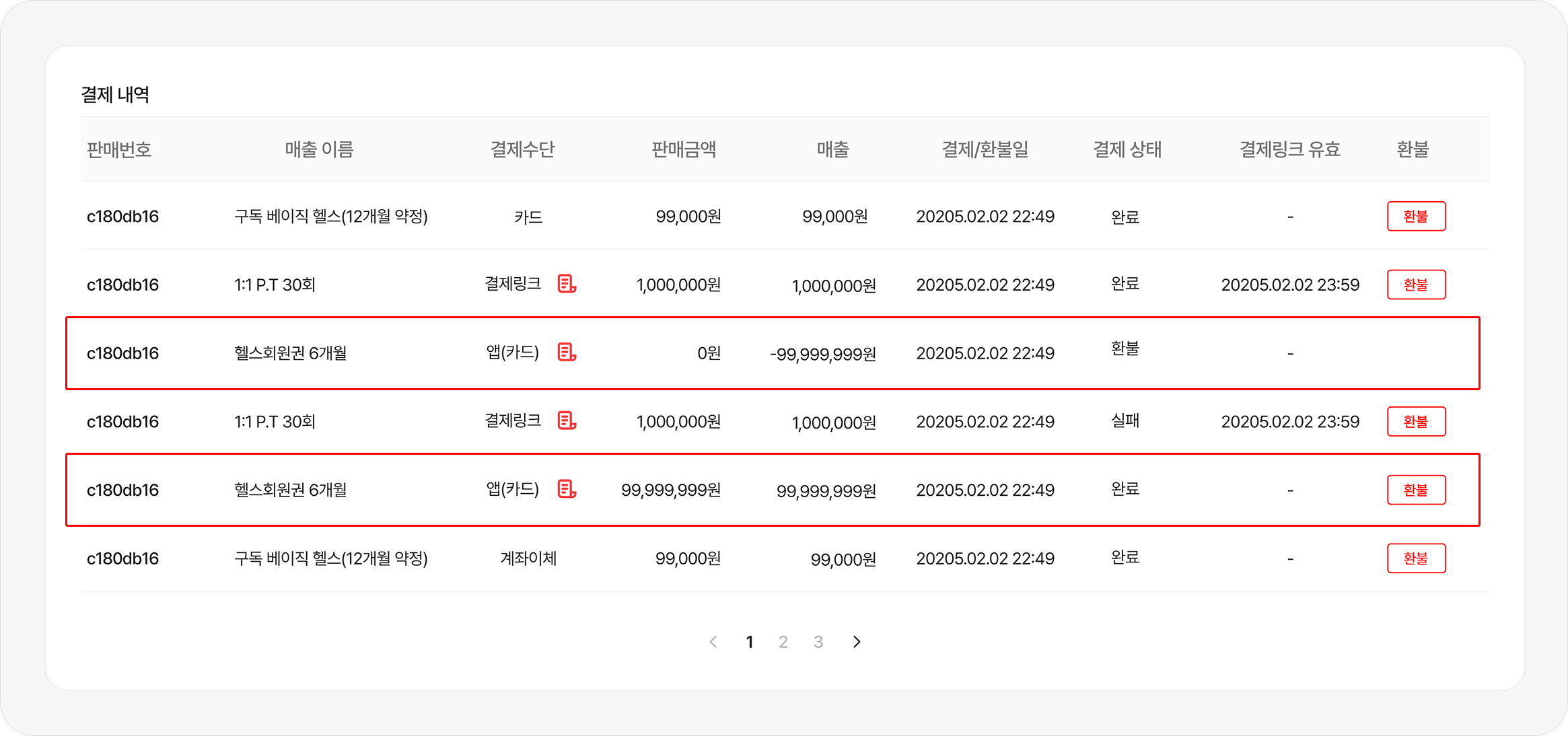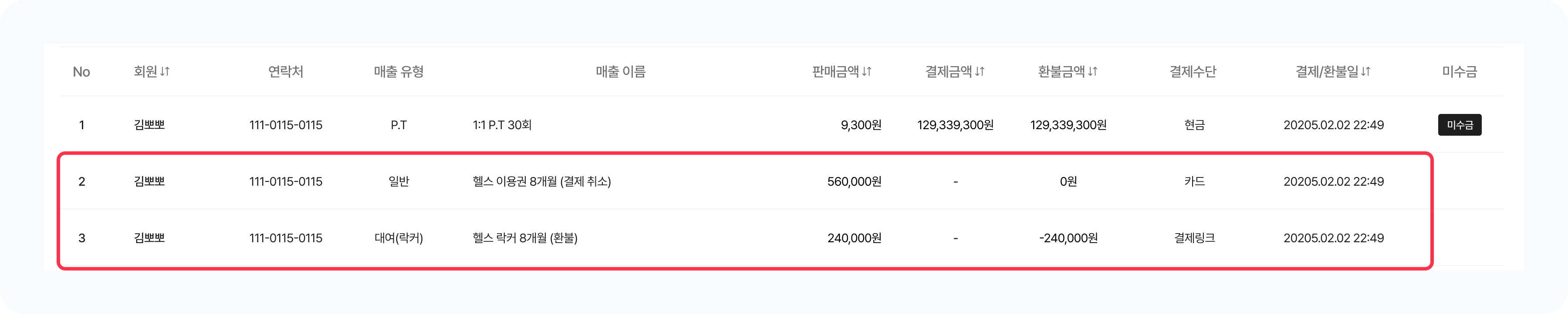 결제 내역을 결제취소 처리한 경우 : [매출(결제금액)]이 삭제처리 되어 [-]로 표기되고 [환불 금액]은 0원으로 표시됩니다.