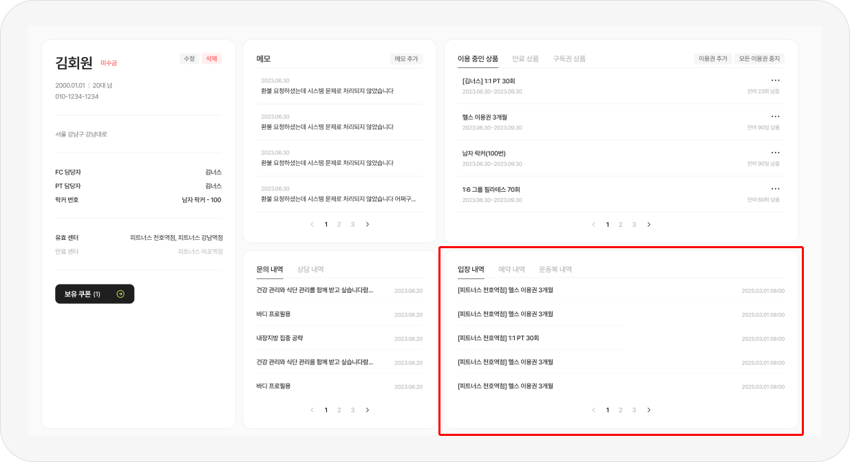 회원의 입장 일시, 이용 센터, 입장 시 사용한 이용권을 확인할 수 있어요.
