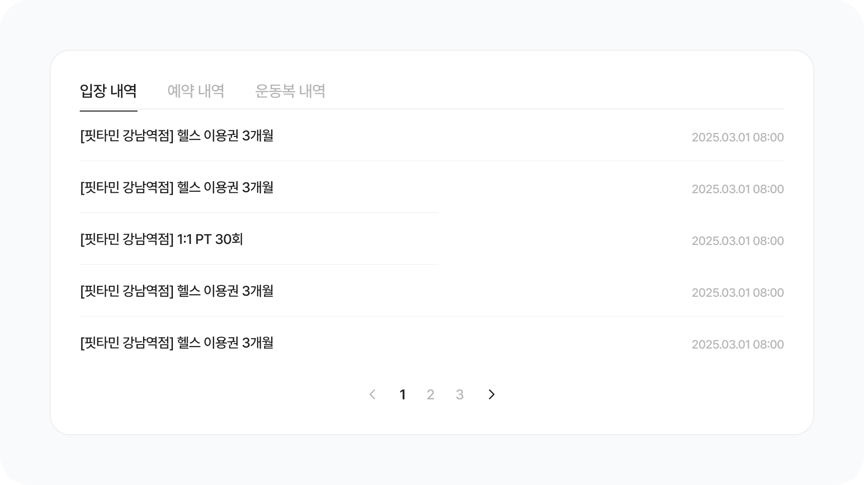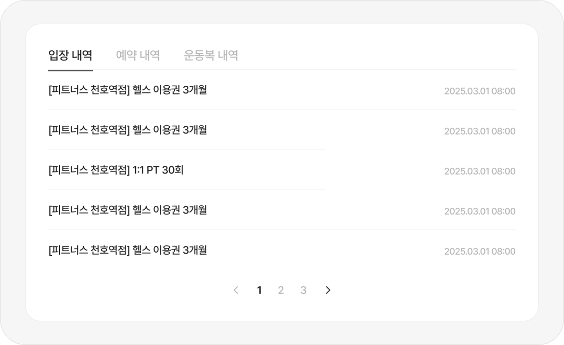 센터 이용 내역 (입장내역, 예약내역, 운동복 내역)