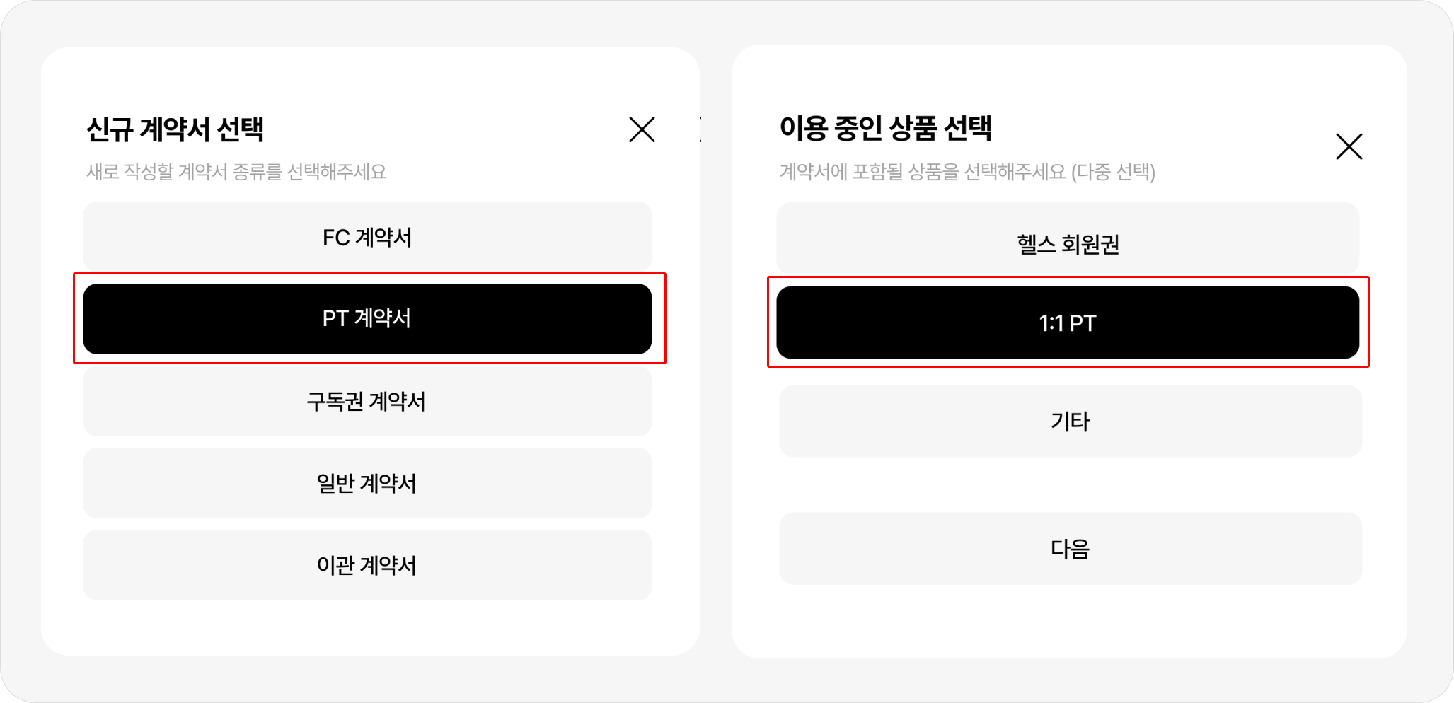 선택한 계약서 양식과 계약서를 작성할 회원 정보를 확인해주세요.