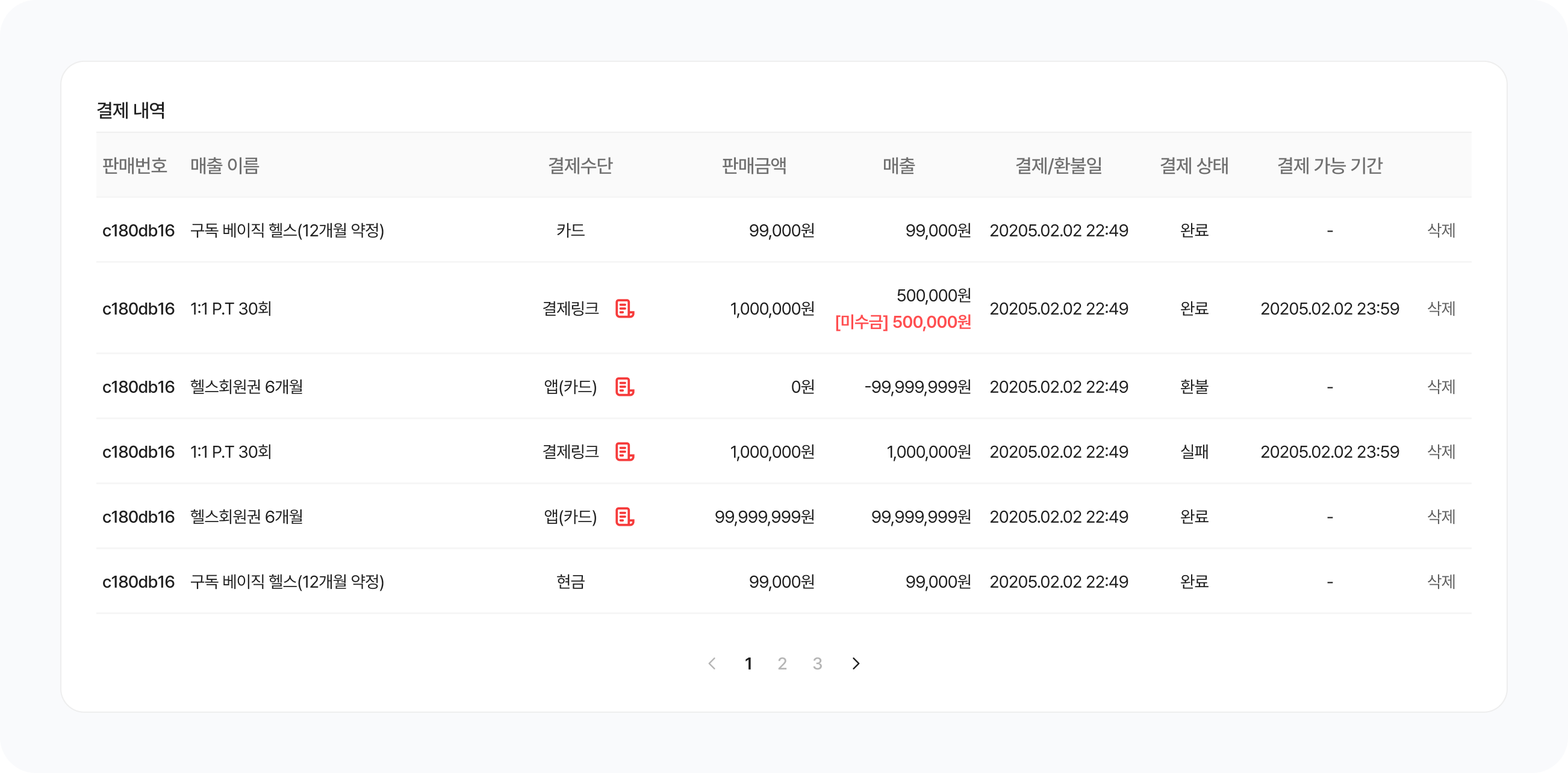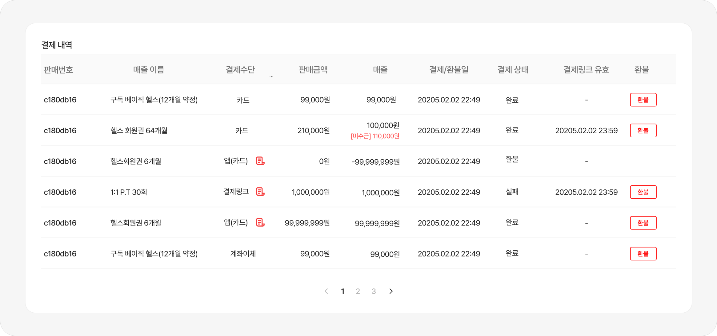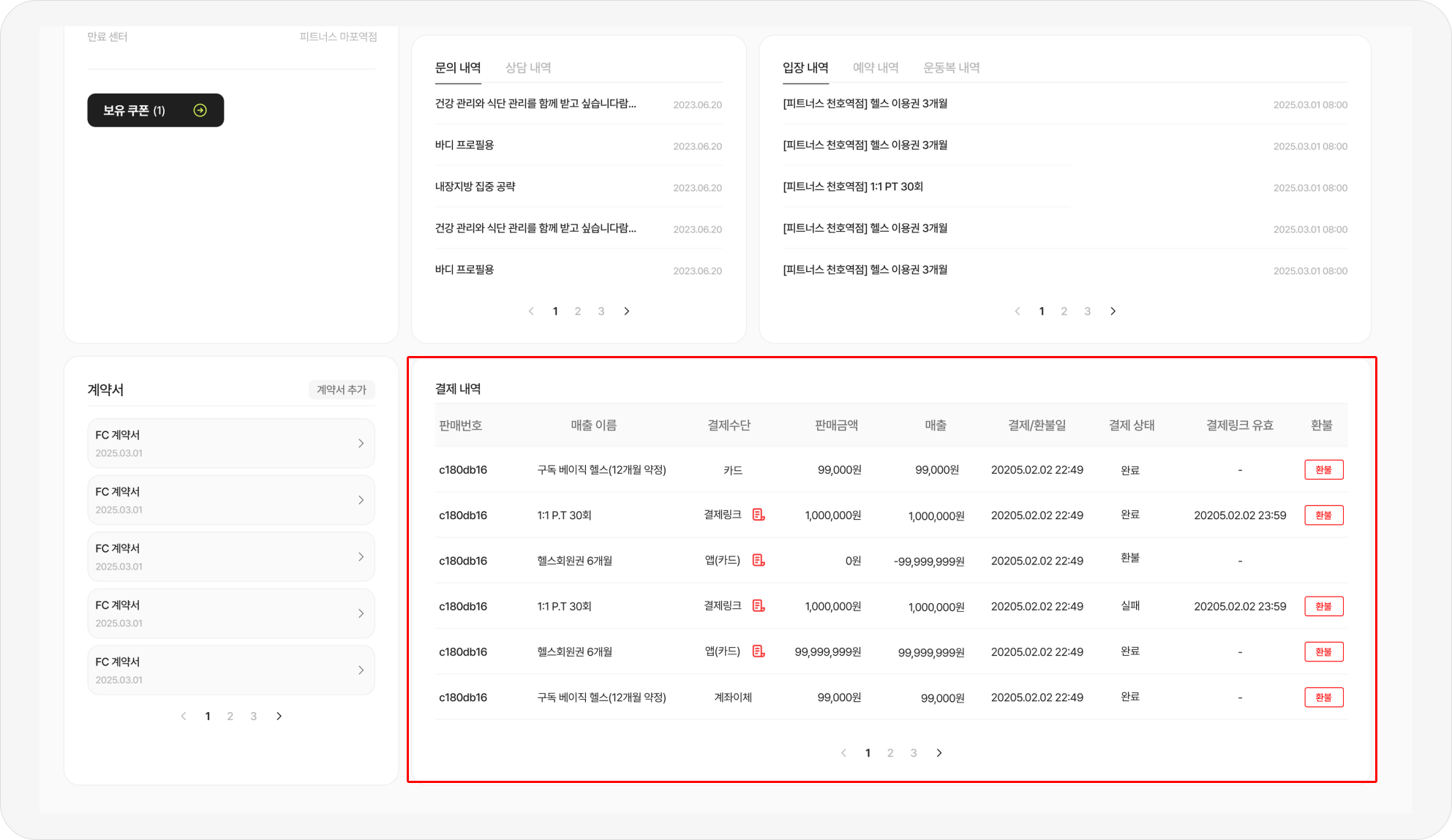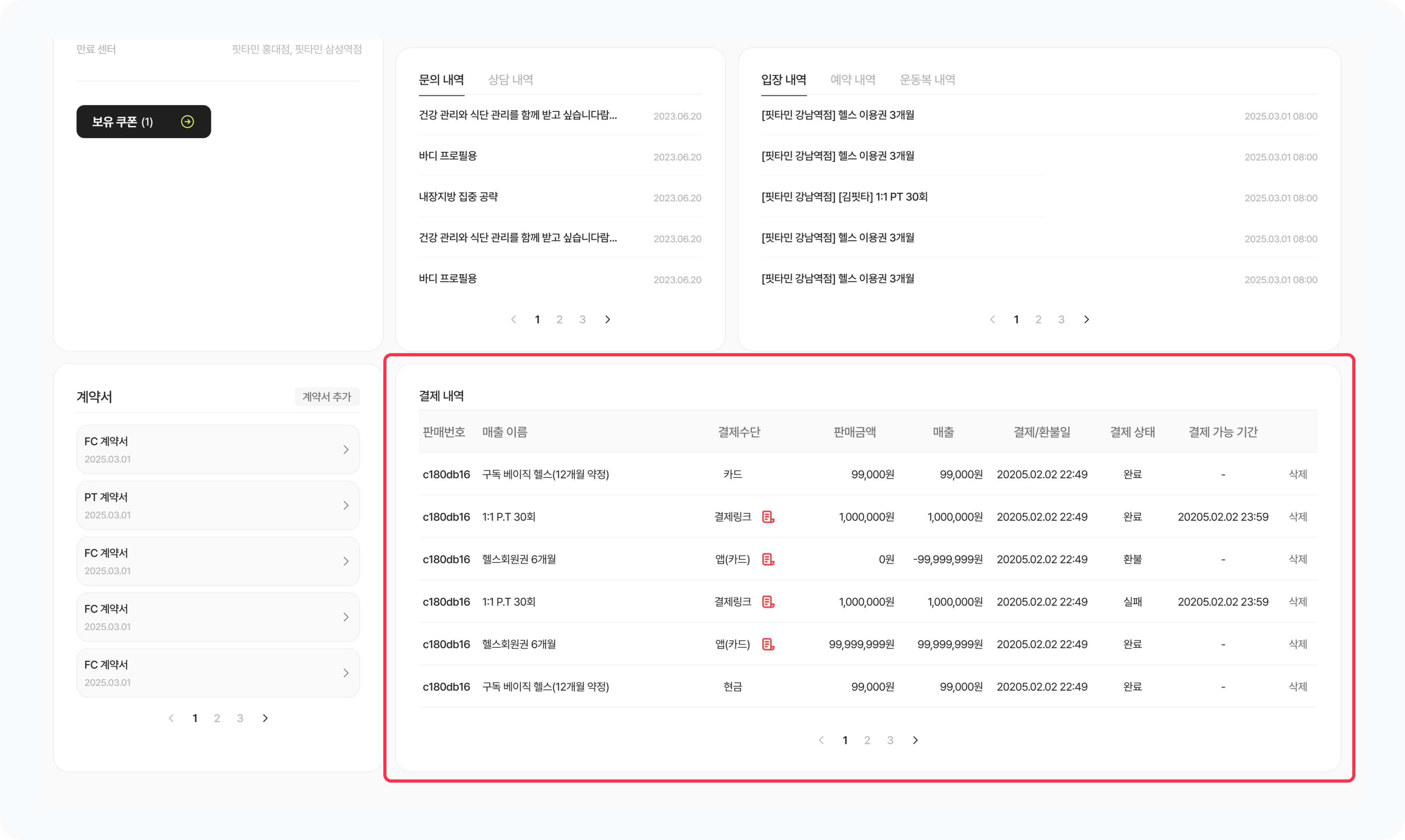 회원이 센터에서 결제한 모든 내역을 한 눈에 확인할 수 있어요.