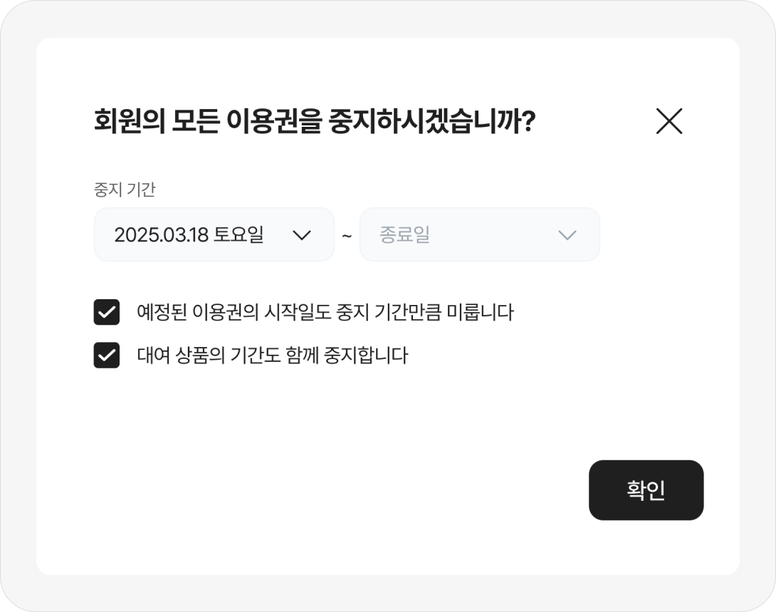 [이용권 중지] 팝업에서 이용권 중지 기간을 설정해주세요.