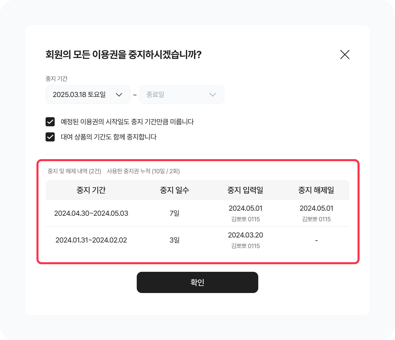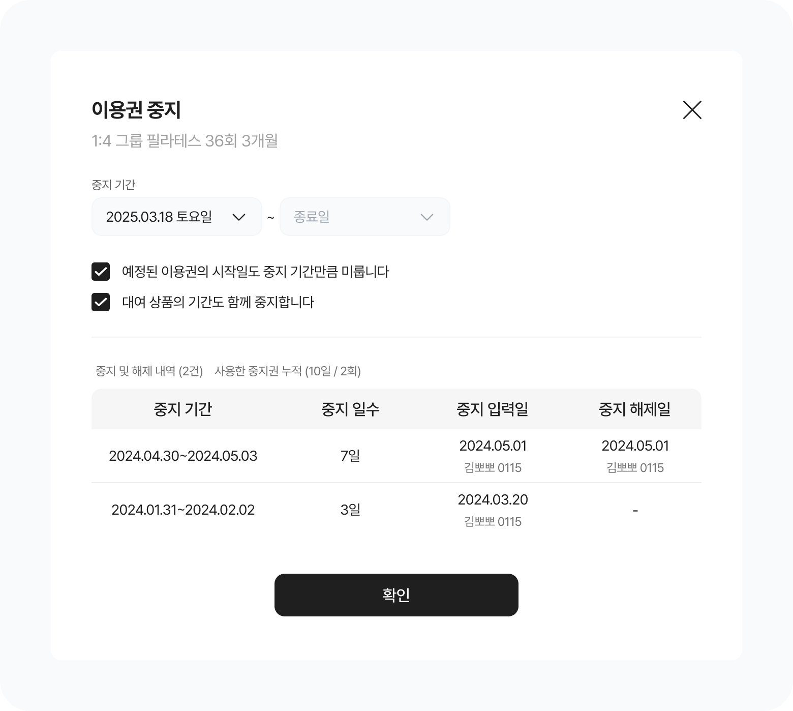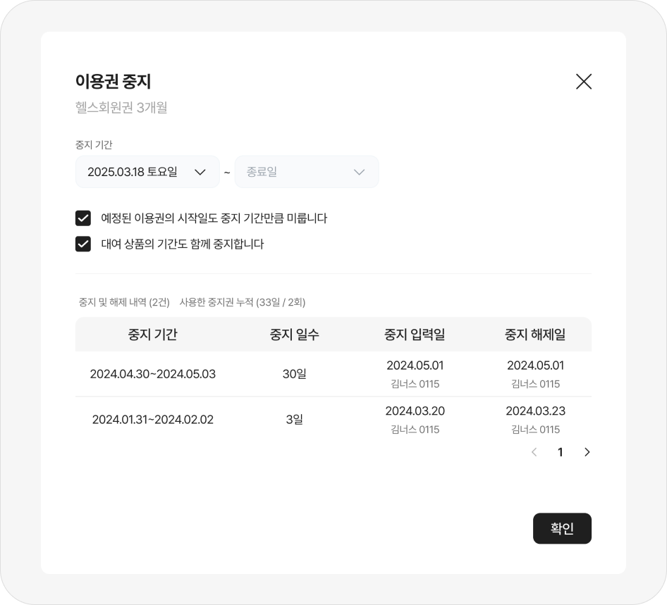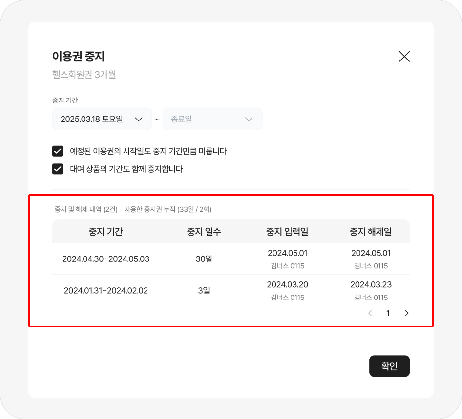 [이용권 중지] 팝업에서 선택한 이용권의 중지 내역을 확인할 수 있어요.