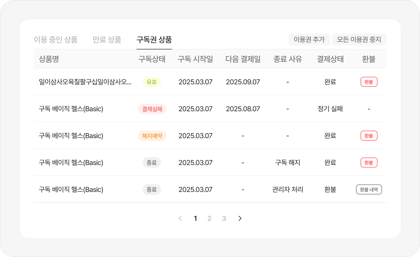 [구독권 상품] 목록에서 회원의 구독 내역을 확인할 수 있어요.