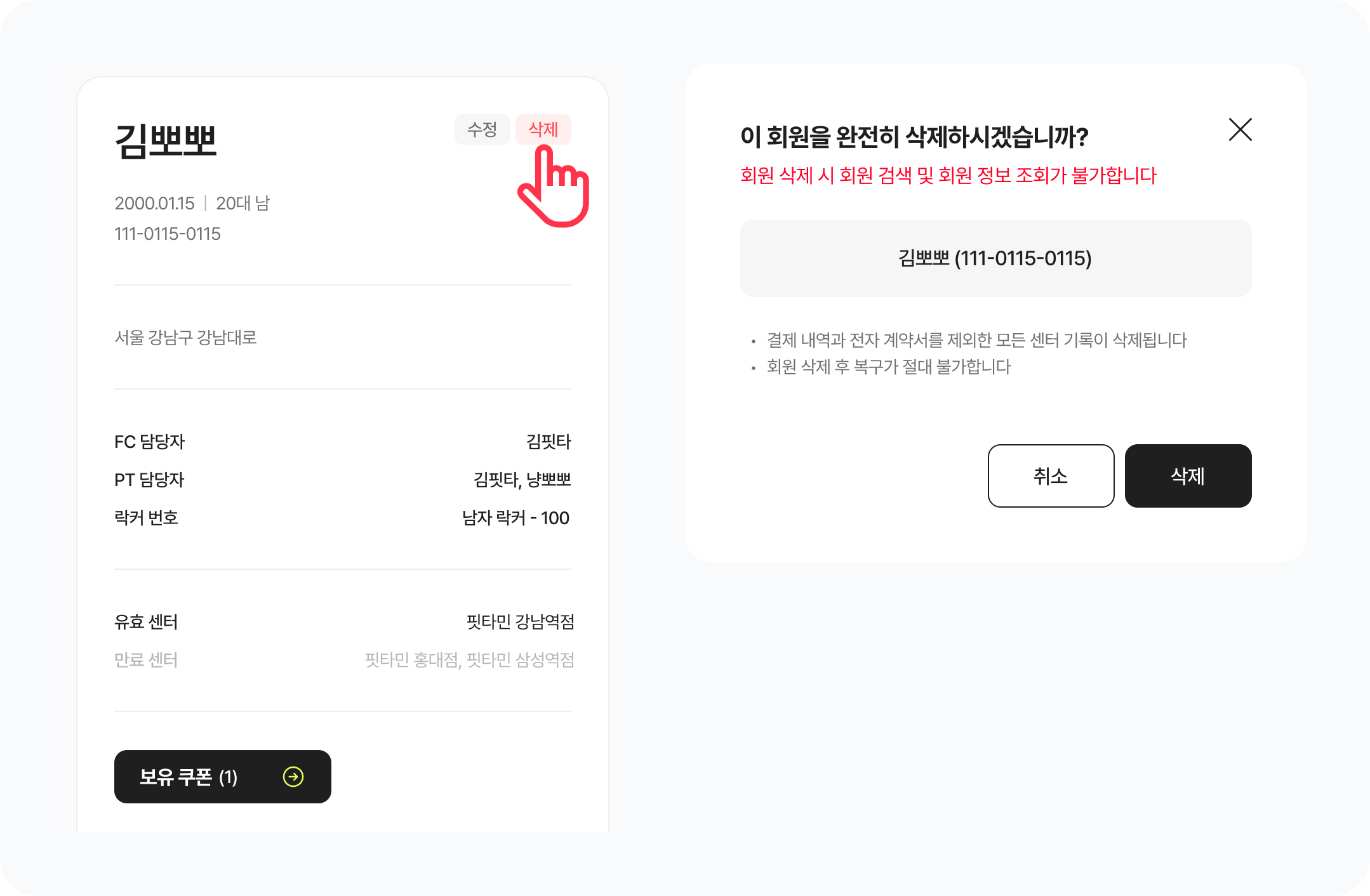 ‼️ 모든 이용권이 만료된 '만료 회원'만 삭제가 가능합니다.