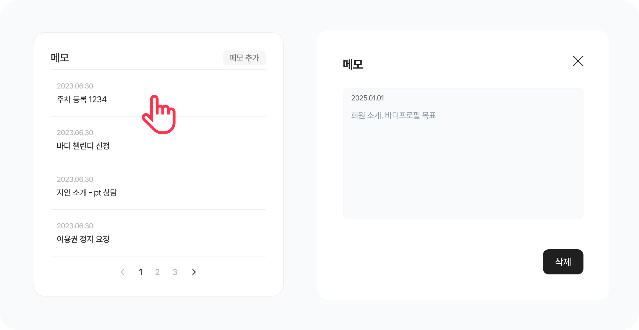 메모를 클릭해 상세 내용을 확인하고 삭제할 수 있어요.