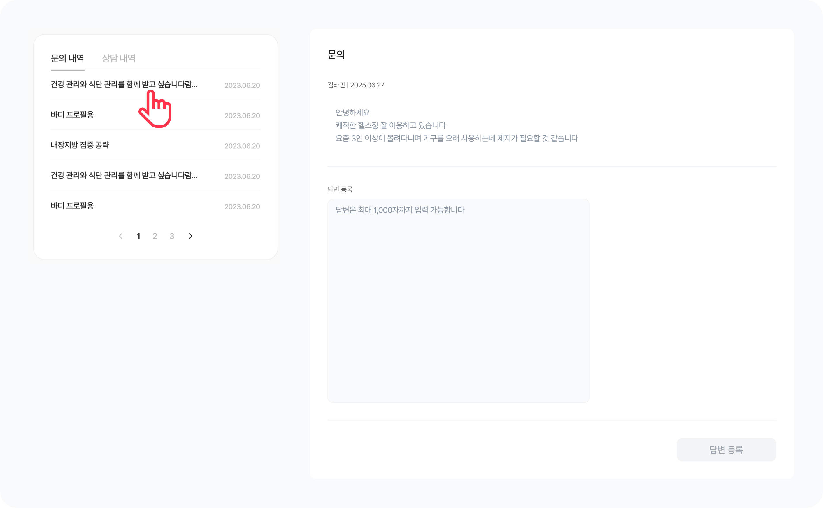 회원이 남긴 문의사항을 확인하고 답변을 등록할 수 있어요.