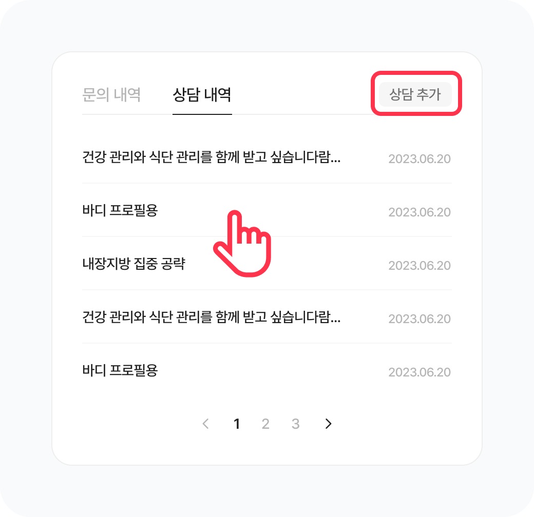 [상담 내역] 탭에서 상담 추가 버튼을 눌러 새로운 상담을 추가하거나 등록된 상담을 선택해 상담 내역을 확인, 수정할 수 있어요.
