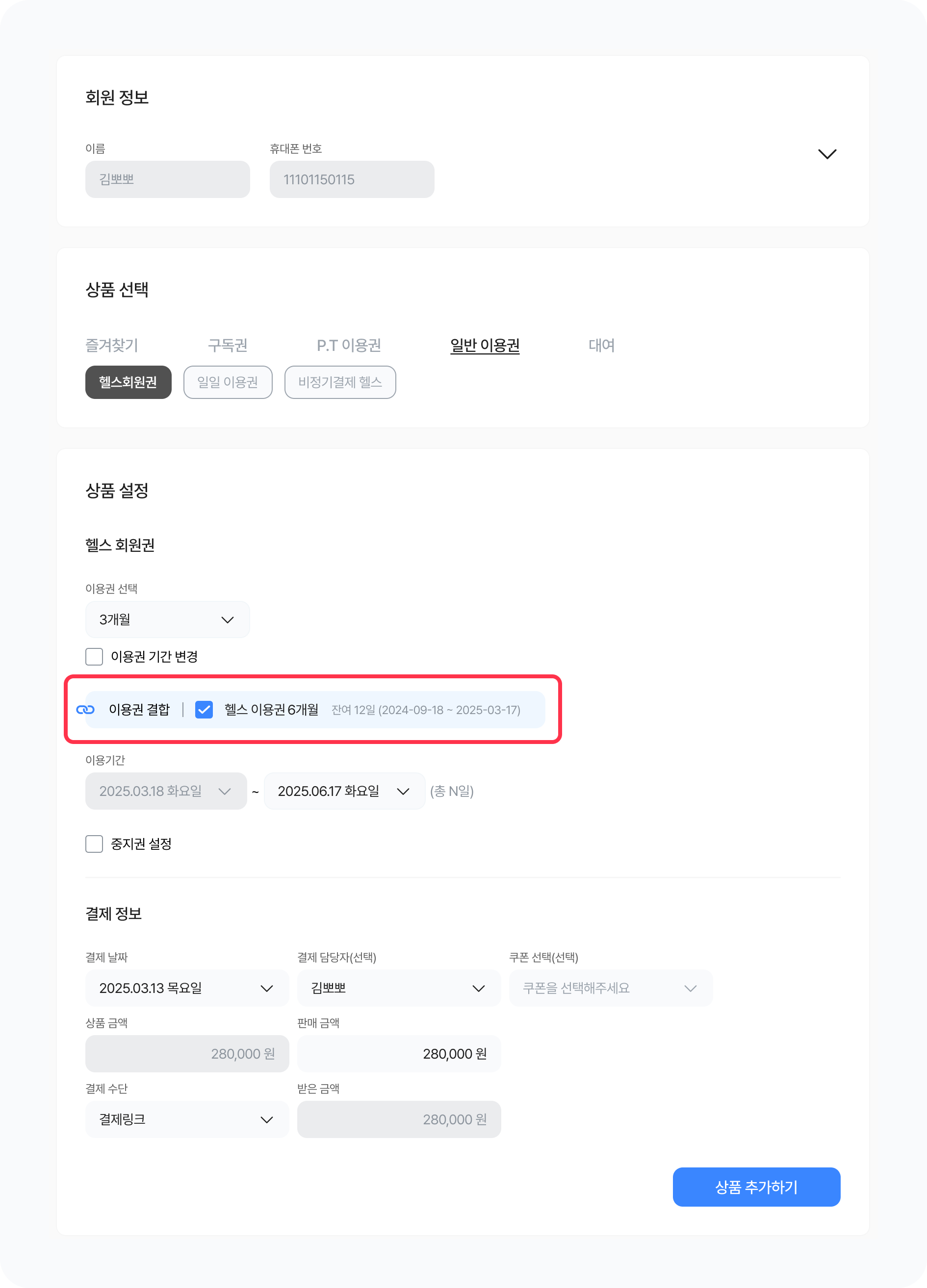 횟수제 상품 : 기존 이용권의 잔여 횟수와 새 이용권의 잔여 횟수가 결합되어 표시됩니다.