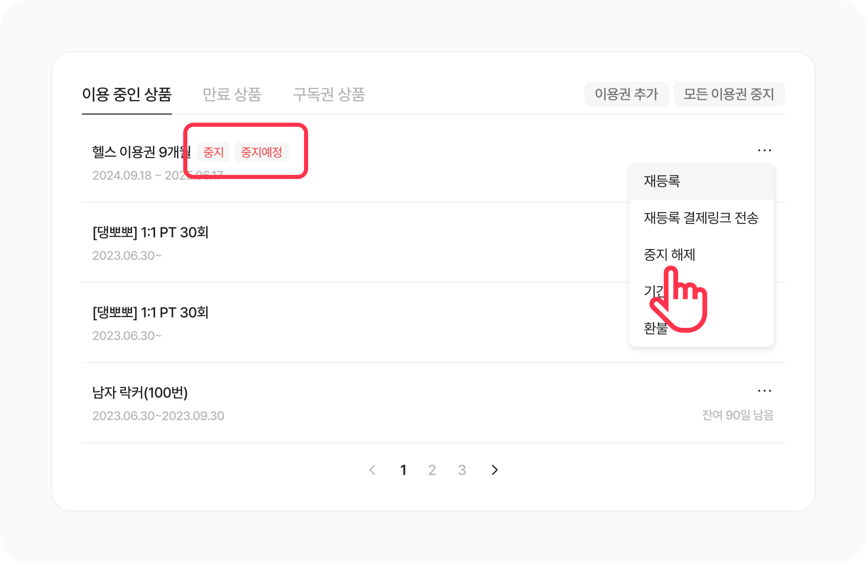 [중지] 또는 [중지예정] 이용권을 선택해 당일 중지 해제 할 수 있어요.