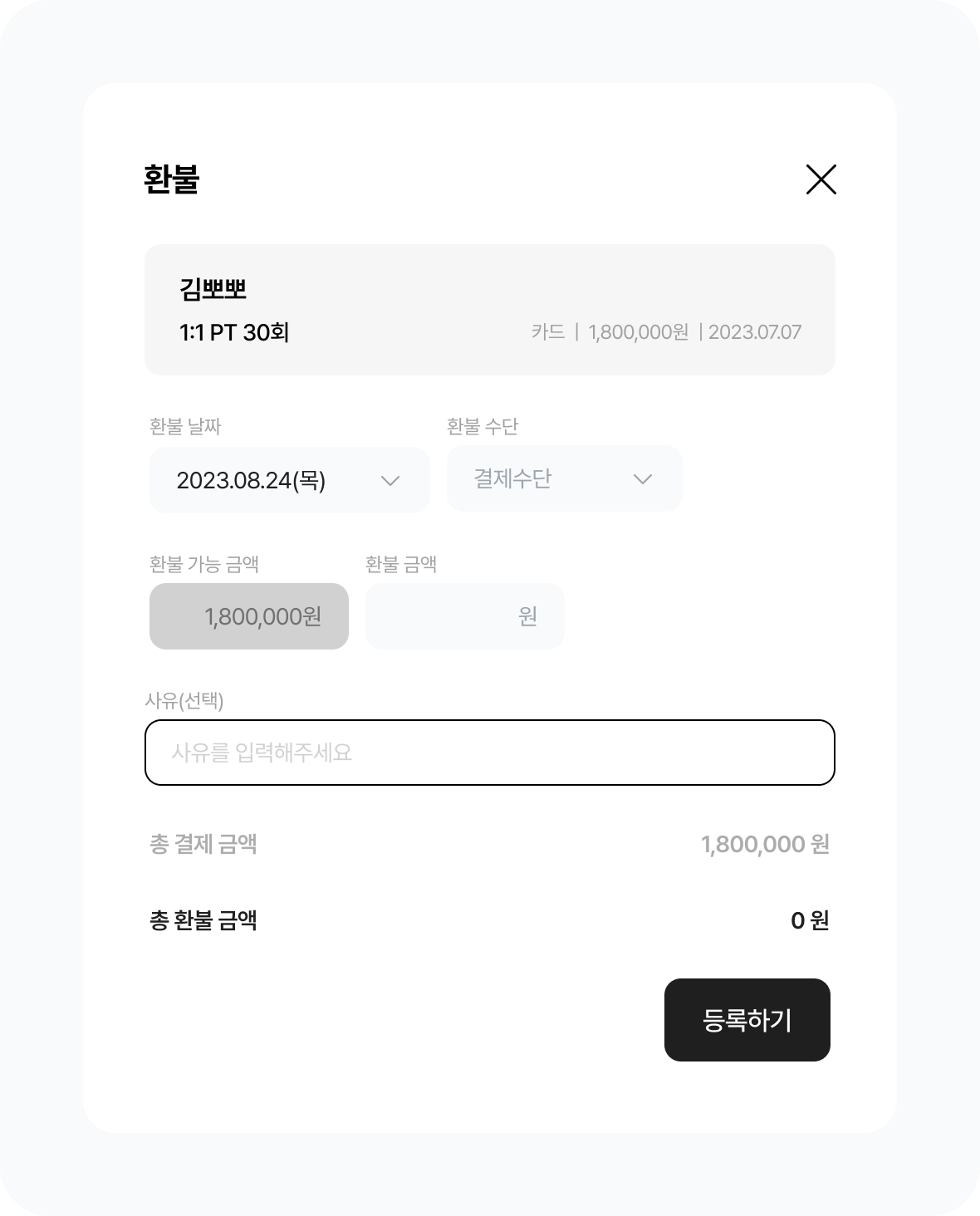 [환불] 팝업에서 환불 내역을 확인, 입력할 수 있어요.