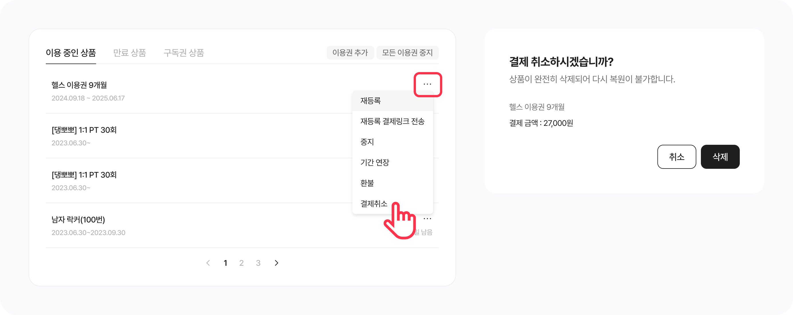 개별 상품의 [상품 옵션 > 결제취소] 버튼을 눌러 이용권을 환불 처리 할 수 있어요.