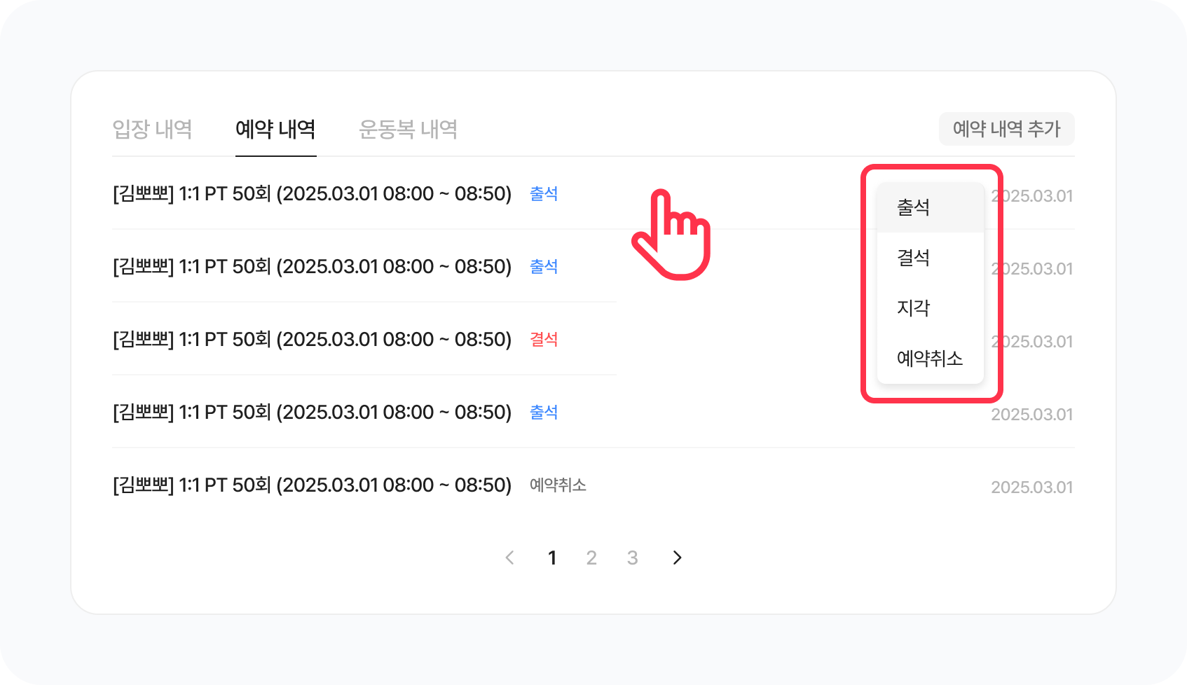 예약 내역을 선택해 출결 기록을 추가, 수정할 수 있어요.