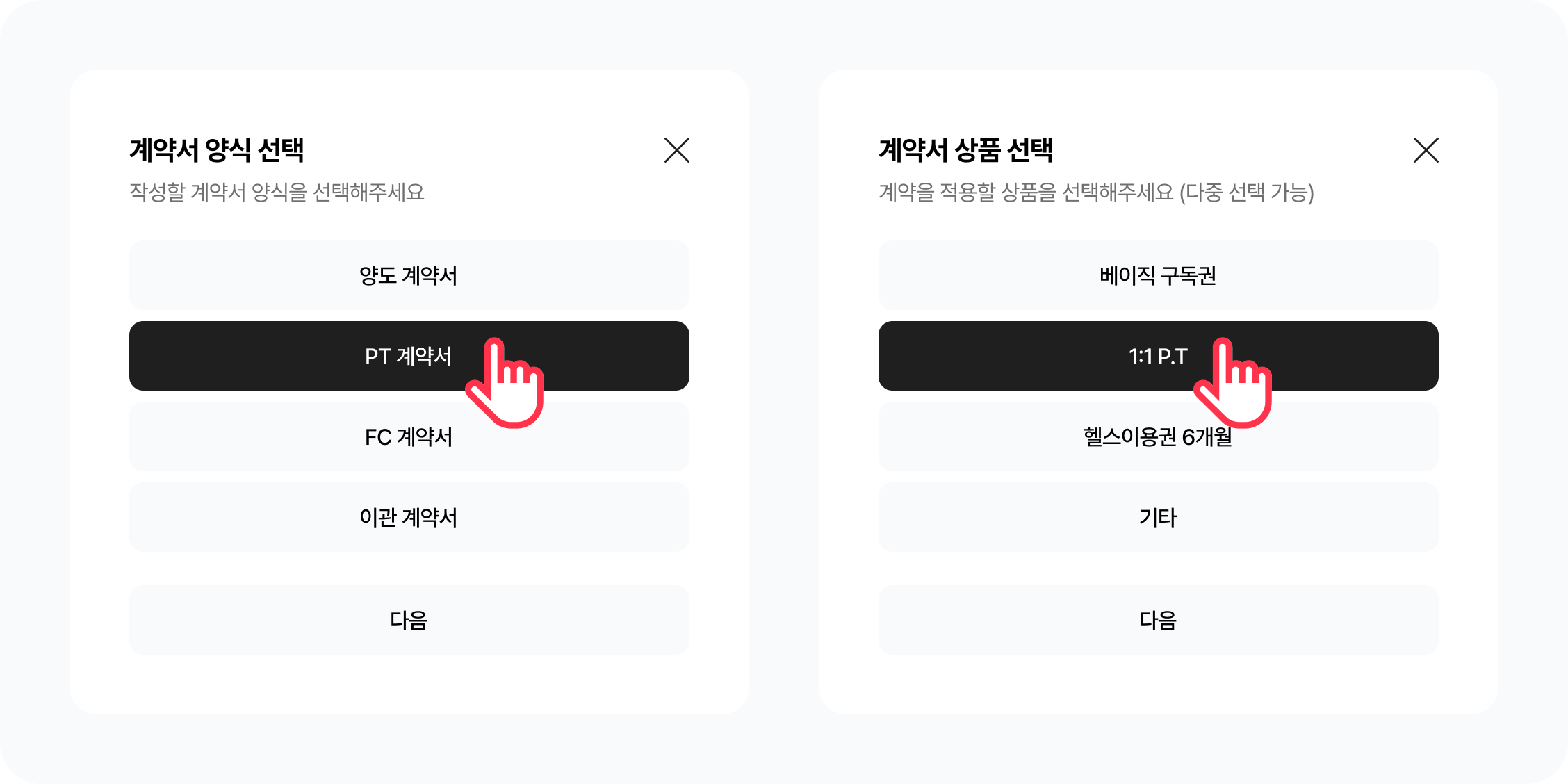 계약서 양식과 계약 상품을 선택한 후 다음 버튼을 누르면 [전자 계약서 작성] 페이지로 이동합니다.