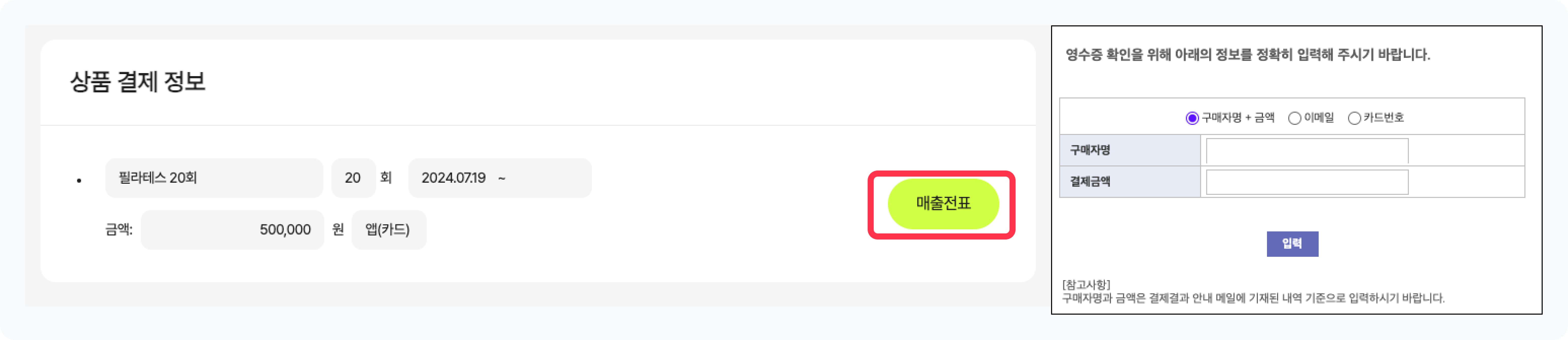 💡앱(카드)로 결제한 상품은 매출전표 버튼을 누른 후 구매자명과 결제금액을 입력하여 매출 전표를 확인할 수 있습니다.