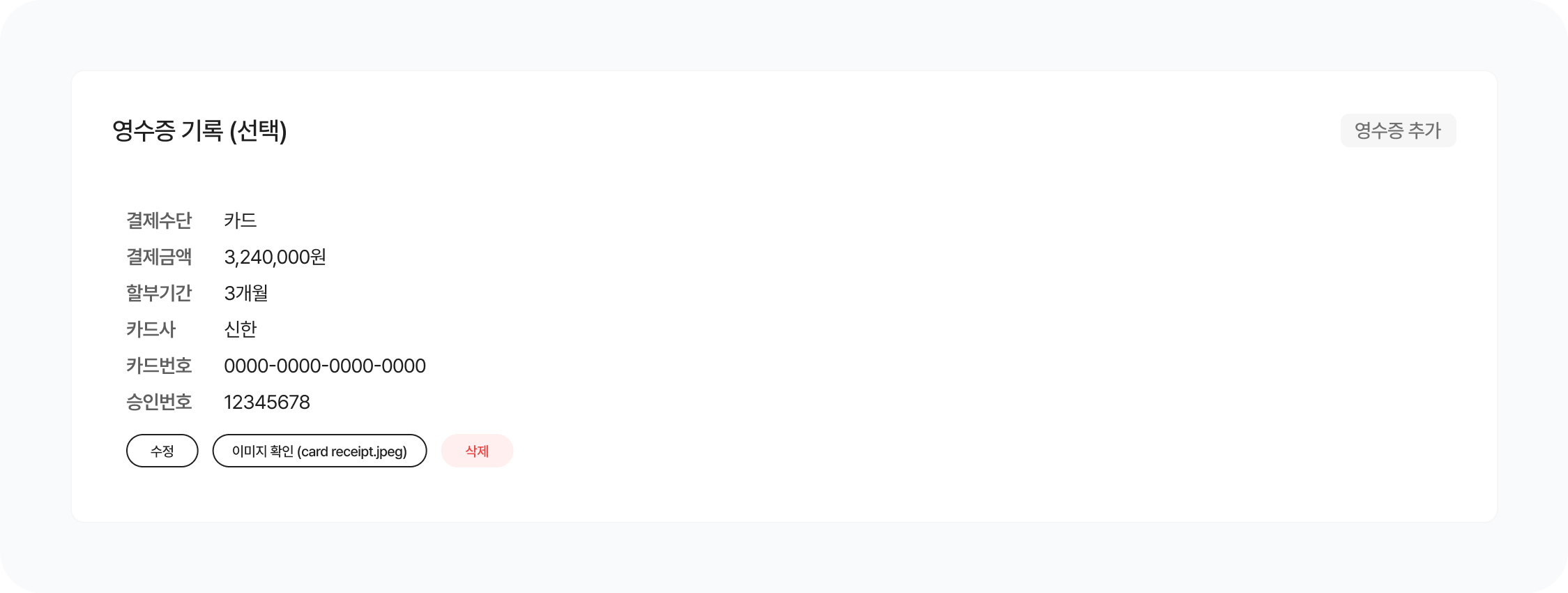 영수증 추가 버튼을 누르면 [영수증 추가] 팝업이 노출됩니다.