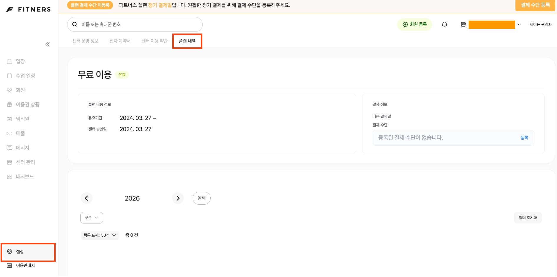 설정 > 플랜 관리 권한 또는 슈퍼 어드민 권한이 있는 경우 아래 메뉴에 접근할 수 있습니다.