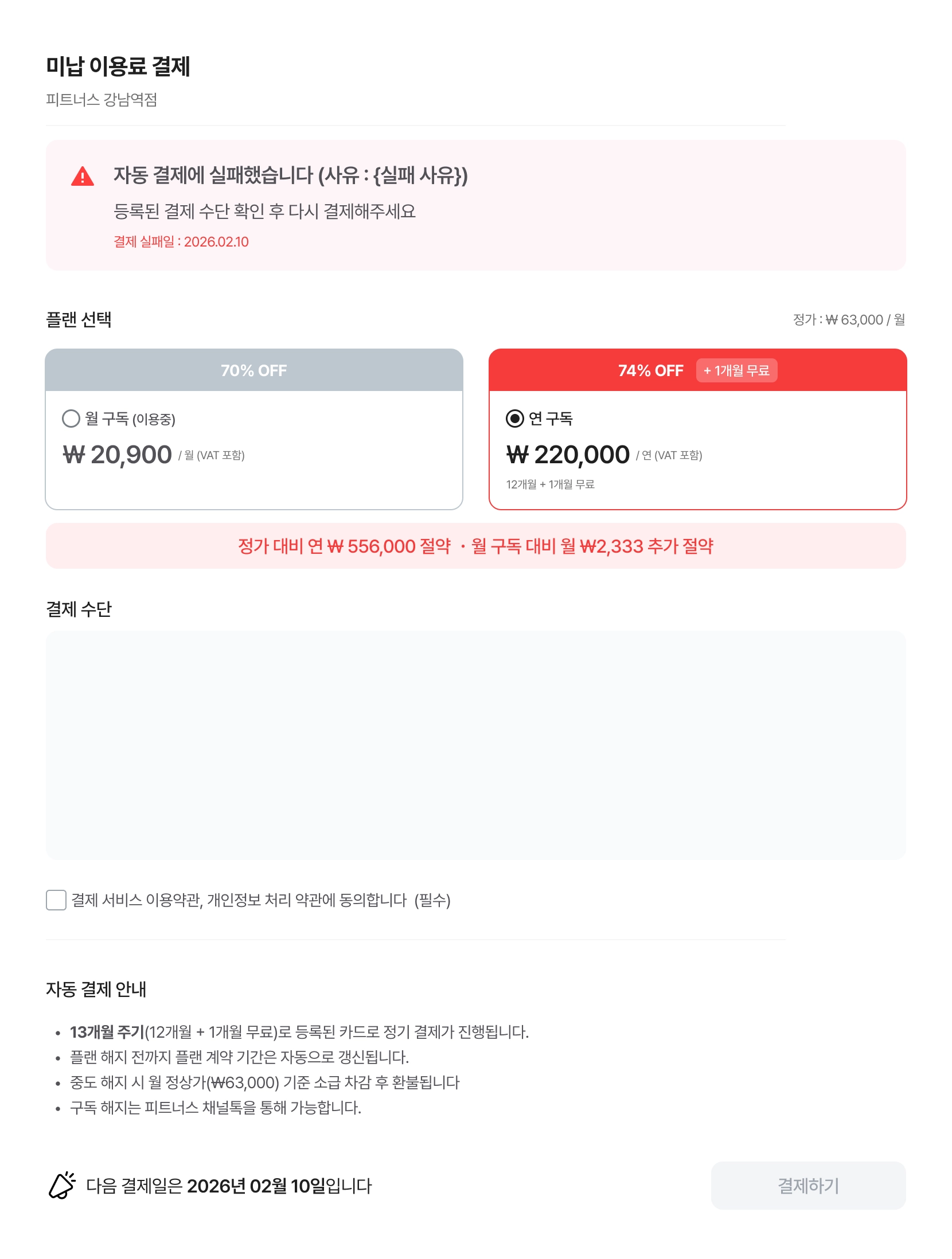 자동결제가 실패했을 때, 결제 실패일로부터 14일 이내에 결제하는 방법을 안내합니다.