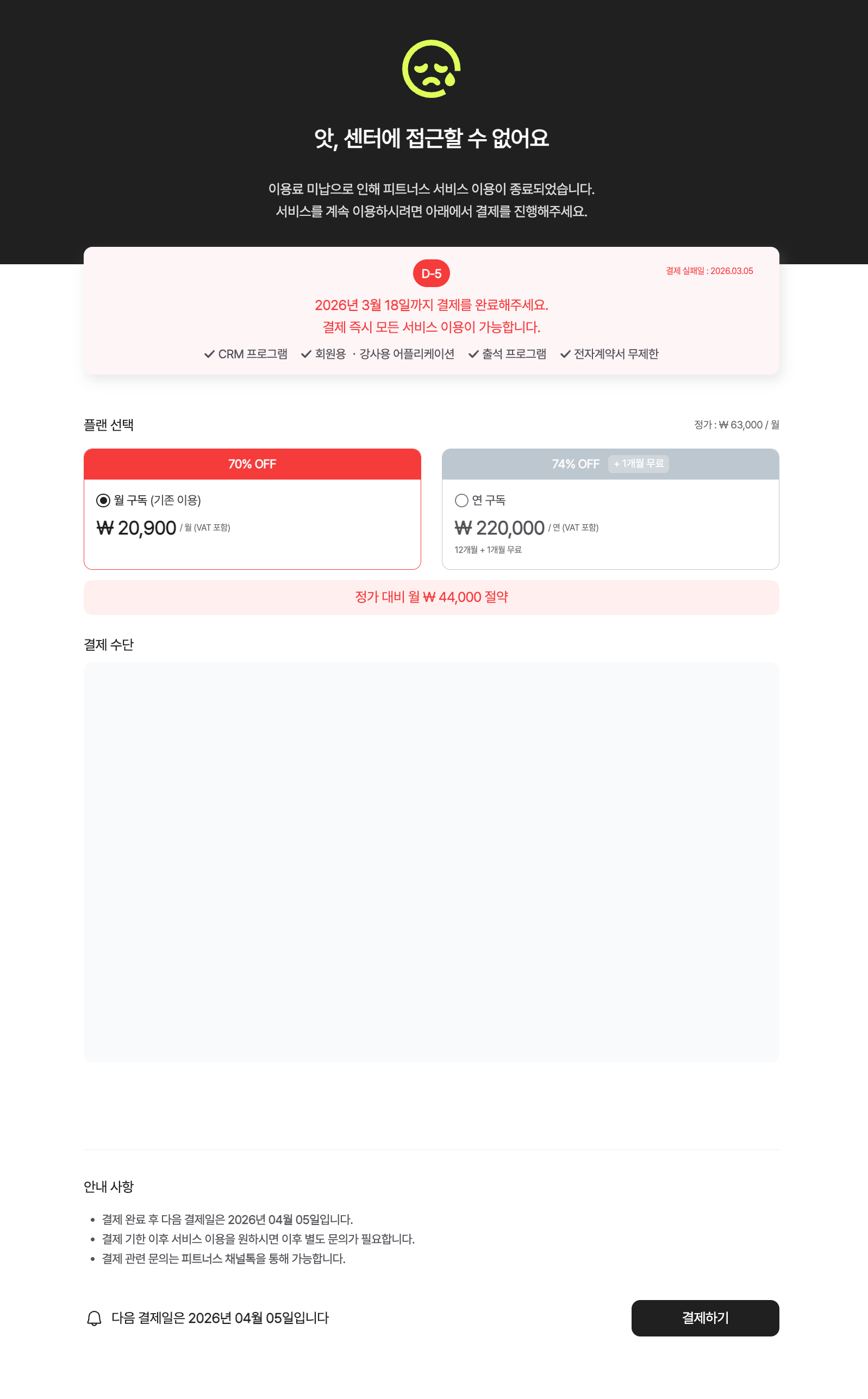 결제 실패 후 15일째부터 CRM의 일반 기능 진입이 차단되며, 플랜 결제 페이지로만 접근할 수 있습니다.
